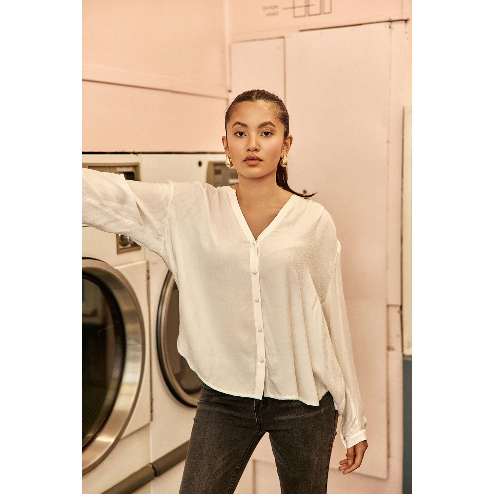 La blouse Bolia est une blouse ample et simple avec un col en V. Elle possède une patte de boutonnage au milieu devant avec des boutons en nacre ton sur ton. La blouse présente des fronces aux épaules à l'avant et à l'arrière ainsi que des manches longues avec des boutons aux poignets.