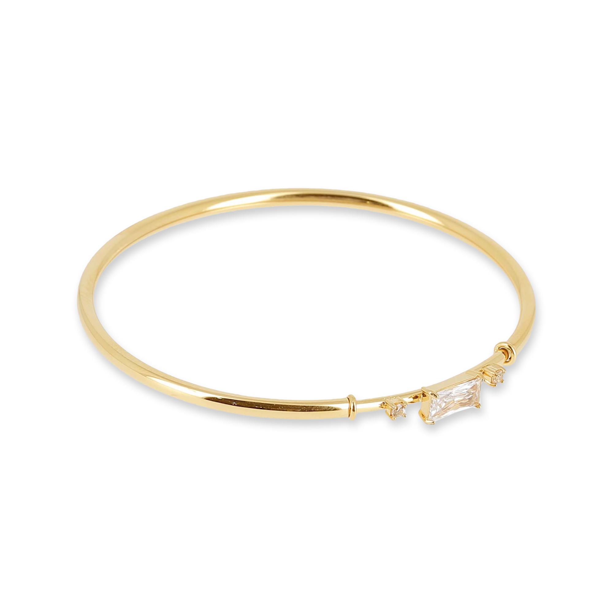Ce jonc délicat de ZAG Bijoux séduit par son design moderne et épuré, sublimé par une finition en acier doré. Le bracelet est orné de trois pierres étincelantes, dont un cristal allongé taillé en baguette qui apporte une touche d’élégance discrète. Grâce à l’acier inoxydable de haute qualité, il offre confort, durabilité et un port agréable au quotidien. Parfait pour un style minimaliste ou pour accompagner une tenue plus habillée.