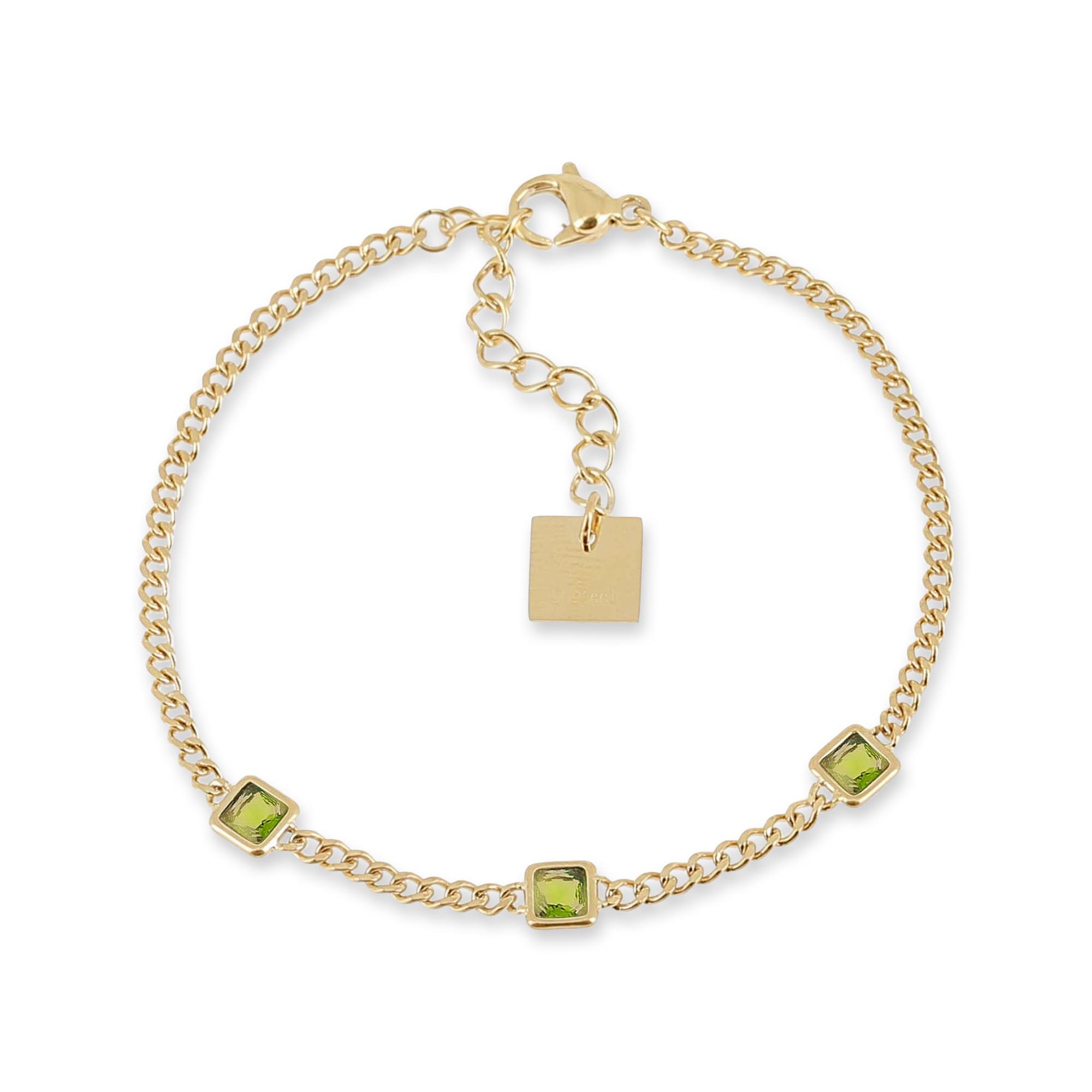 Ce bracelet délicat signé ZAG Bijoux séduit par sa finesse et son éclat coloré. Sa chaîne en acier doré à l’or fin accueille trois zirconiums verts sertis dans des montures carrées, apportant une touche lumineuse et raffinée. Léger et confortable, il se porte aisément au quotidien ou pour sublimer une tenue plus habillée. Grâce à sa chaînette d’extension, la longueur est ajustable pour un confort parfait. Un bijou élégant et intemporel.