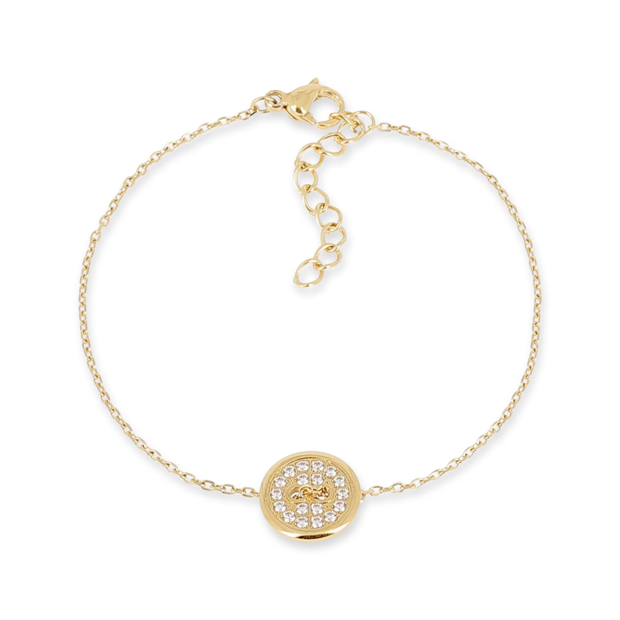 Ce bracelet raffiné signé ZAG Bijoux se distingue par son médaillon rond en acier doré, entièrement serti de zirconiums blancs pour un éclat lumineux et délicat. Sa fine chaîne en acier inoxydable doré à l’or fin s’adapte aisément au poignet grâce à une chaînette d’extension. Un bijou élégant et intemporel, parfait porté seul ou en accumulation pour sublimer toutes vos tenues.