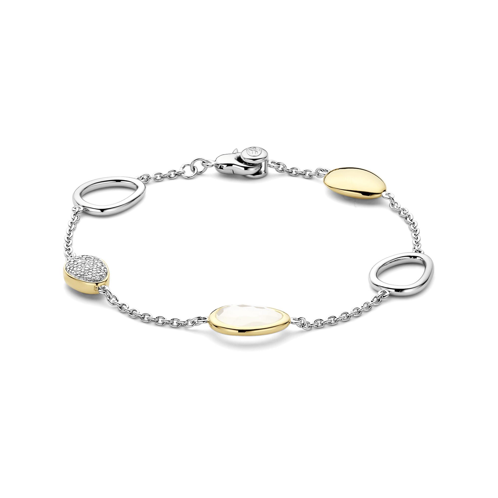 Le bracelet TI SENTO en argent sterling 925 avec finition platine se distingue par cinq éléments en forme de galet : une pierre blanc laiteux encadrée d’or jaune, un accent poli en or jaune, un galet platine miroir et un disque pavé de zircones étincelantes. L’harmonie des couleurs, des reflets et des formes confère au bracelet une élégance fluide, idéale seule ou en accumulation avec d’autres bracelets.