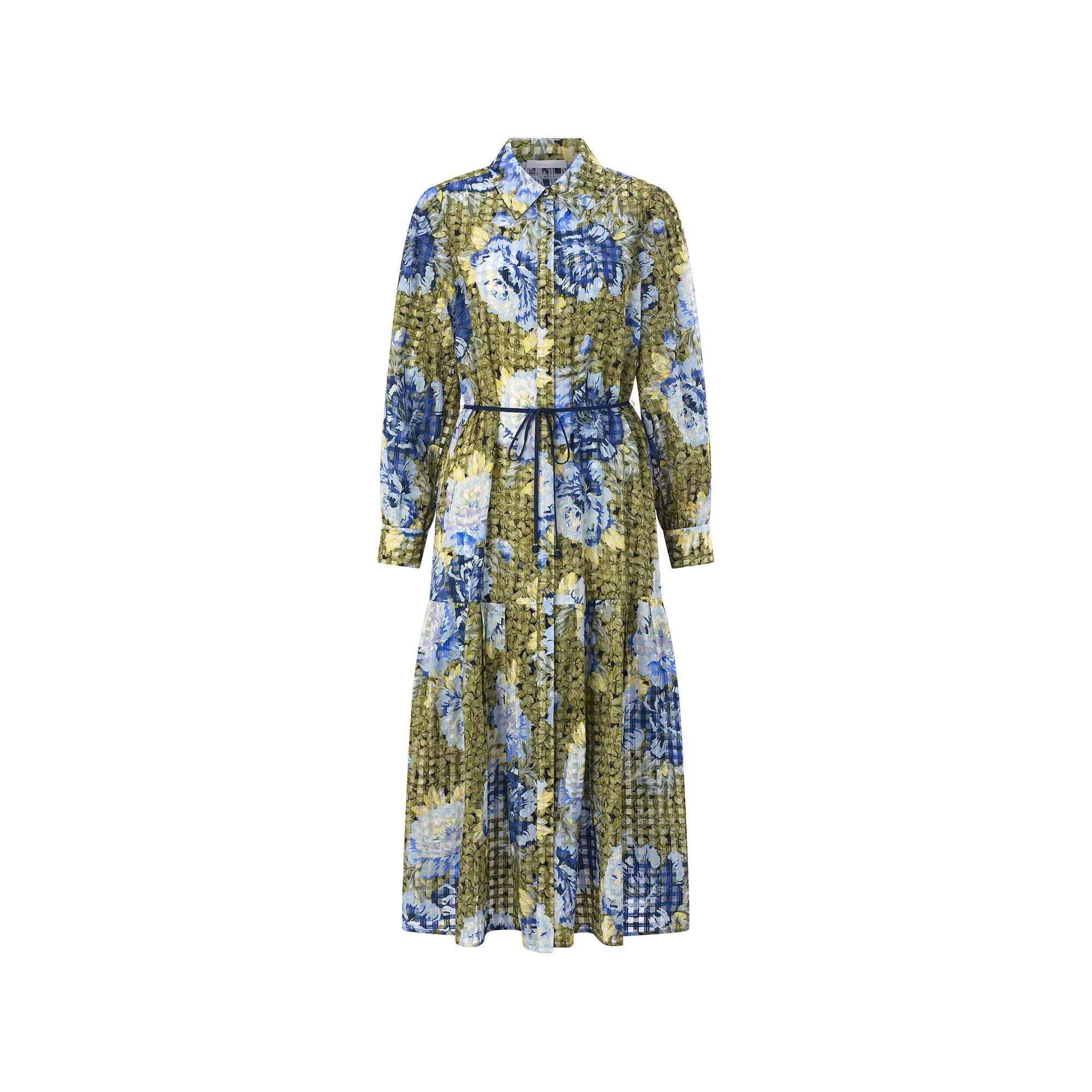 Cette robe midi présente un imprimé floral éclatant, combinant des nuances de bleu et de jaune sur un fond vert. Le design comprend un col chemise classique et des manches longues avec des poignets boutonnés. Une ceinture à nouer à la taille permet un ajustement personnalisable, créant une silhouette flatteuse. La robe est conçue avec une patte de boutonnage sur toute la longueur et une jupe étagée, ajoutant à son apparence élégante et fluide.