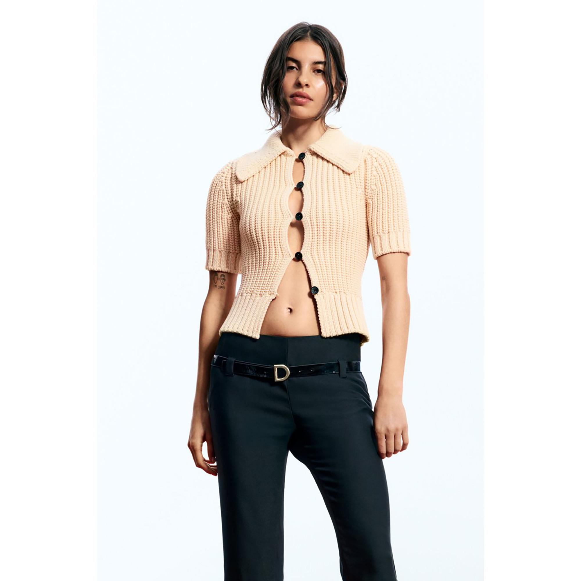 Ce pull court à manches courtes en maille côtelée est doté d'un col classique et d'une fermeture boutonnée, offrant un ajout polyvalent et élégant à toute garde-robe. La texture côtelée assure un ajustement confortable et une touche de sophistication.