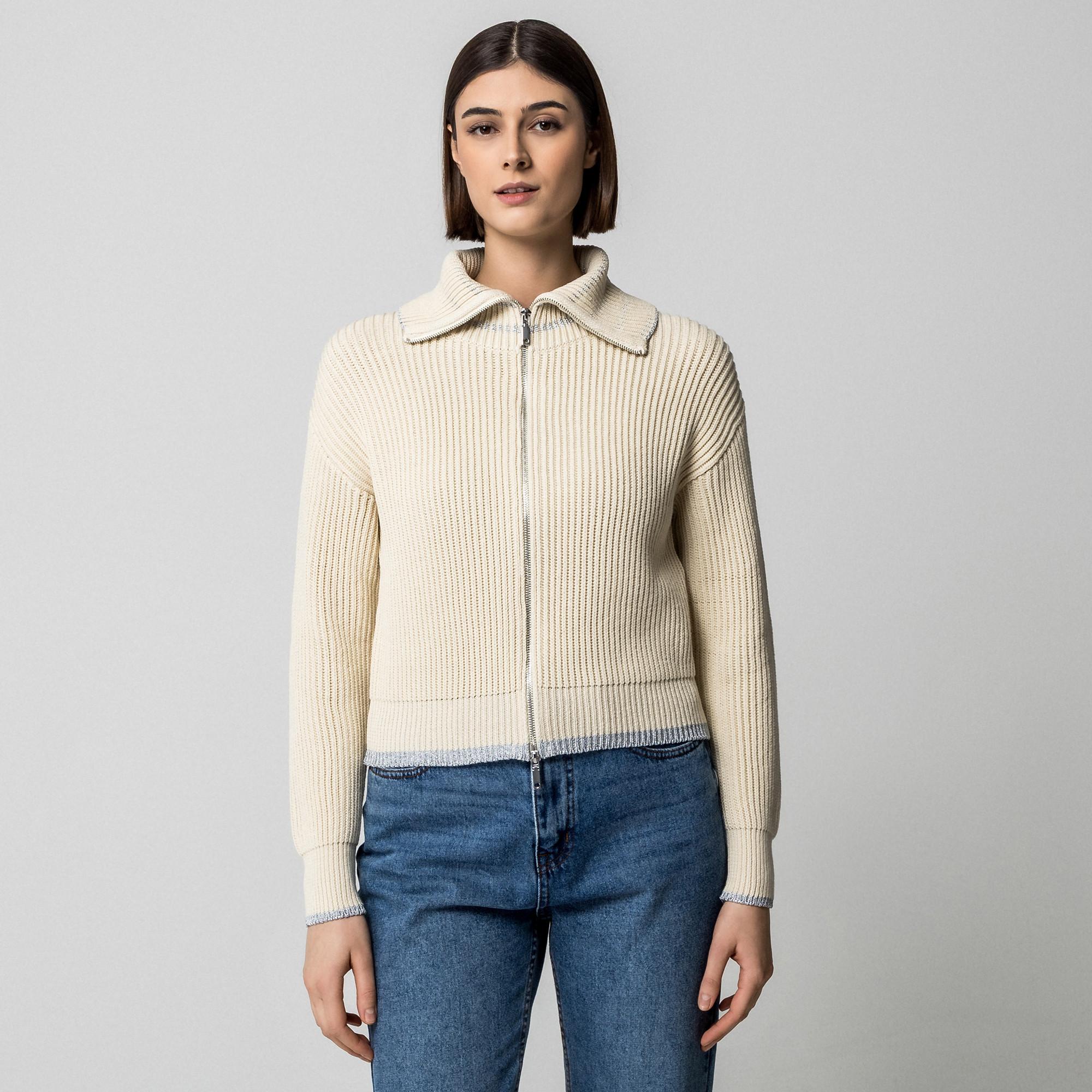 Ce cardigan en maille côtelée est doté d'une fermeture éclair intégrale et d'un col montant, offrant un ajout polyvalent à toute garde-robe. Le design comprend de subtils détails contrastants à l'ourlet et aux poignets, apportant une touche raffinée.