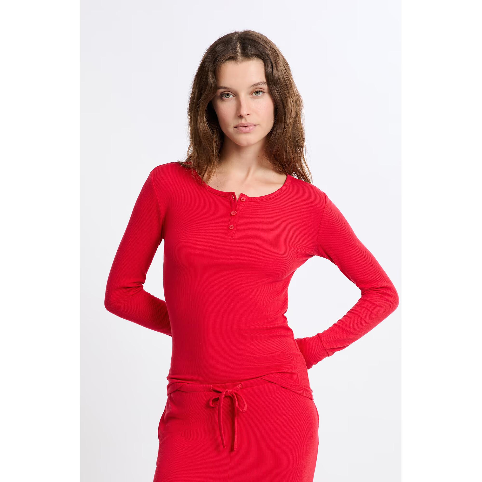 Ce t-shirt à manches longues présente un col Henley classique avec une patte de boutonnage, offrant un look intemporel et polyvalent. La texture côtelée ajoute des détails subtils et du confort, le rendant adapté à diverses occasions décontractées.