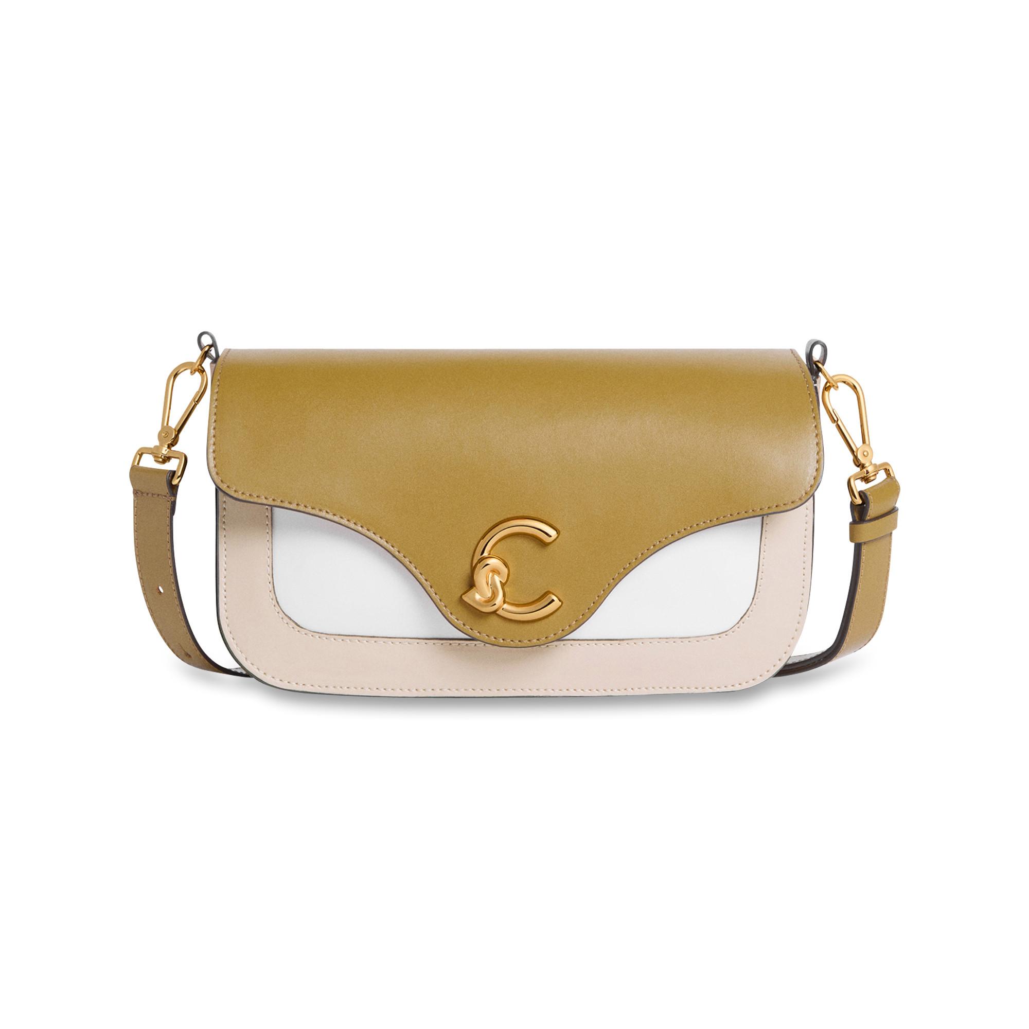 Ce sac à bandoulière présente un design sophistiqué avec un rabat et un fermoir distinctif en forme de C doré. Le sac arbore une esthétique color block multi-tons, combinant un vert olive riche sur le rabat avec des panneaux blancs et beige clair sur le corps. Il est équipé d'une bandoulière détachable et réglable, permettant des options de transport polyvalentes.