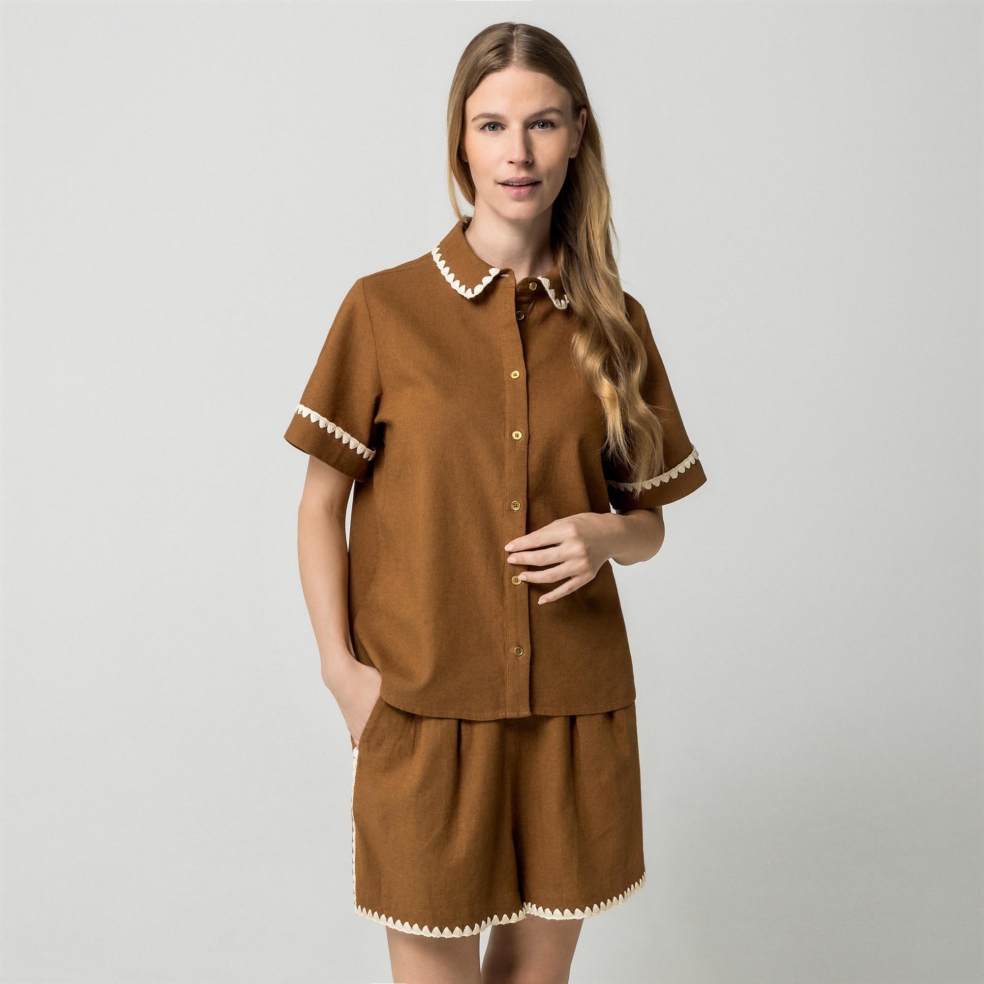 Ce chemisier à manches courtes est doté d'un col classique et d'une patte de boutonnage complète, offrant un look intemporel et polyvalent. La bordure festonnée le long du col et des poignets ajoute un détail délicat et charmant au design.