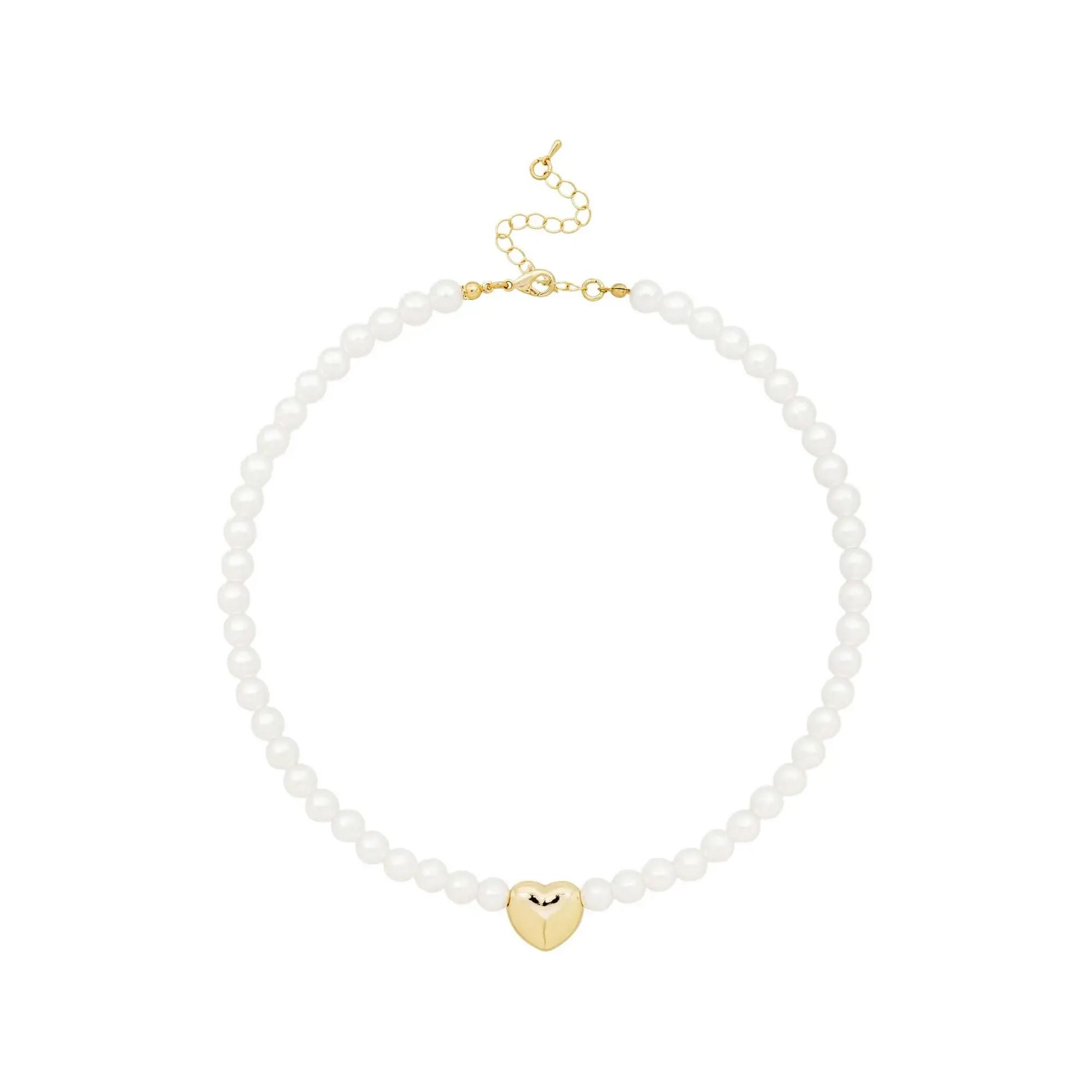 Le collier – Pure Heart est composé de perles artificielles blanches et scintillantes et possède un pendentif au centre. Le pendentif brille dans une teinte dorée et a la forme d’un cœur. Une chaîne d’extension dorée complète le design.