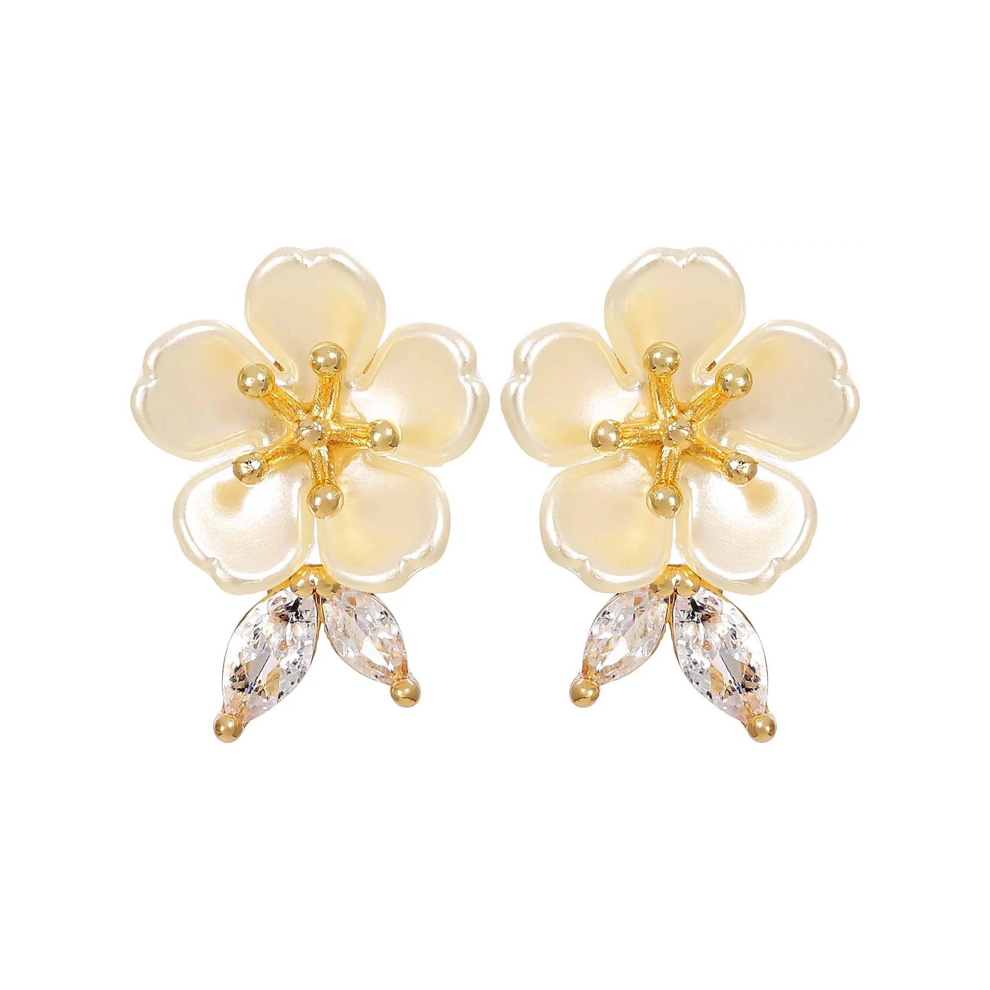 Les boucles d'oreilles "Noble Blossom" scintillent en or et sont décorées de pierres en cubic zirconia étincelantes. Les boucles d'oreilles ont l'apparence d'une fleur blanche et brillante, avec la texture d'une perle artificielle.