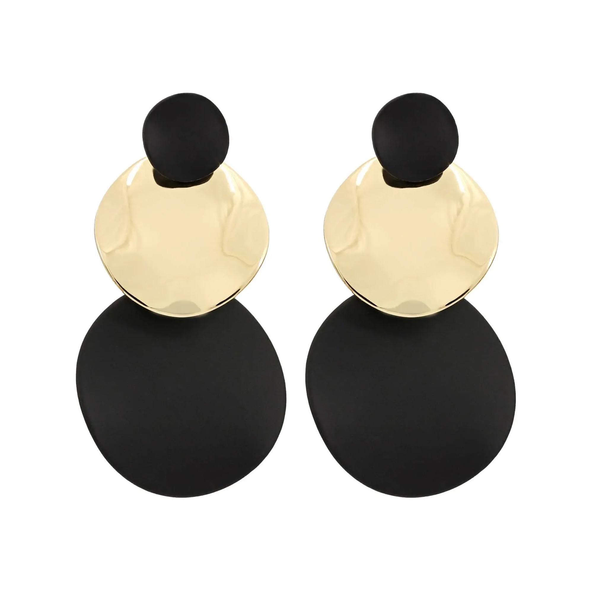 Les boucles d'oreilles "Classic Plates" sont composées de disques noirs et dorés. Ces magnifiques boucles d'oreilles se combinent aussi bien avec des bijoux dorés qu'avec des bijoux noirs !