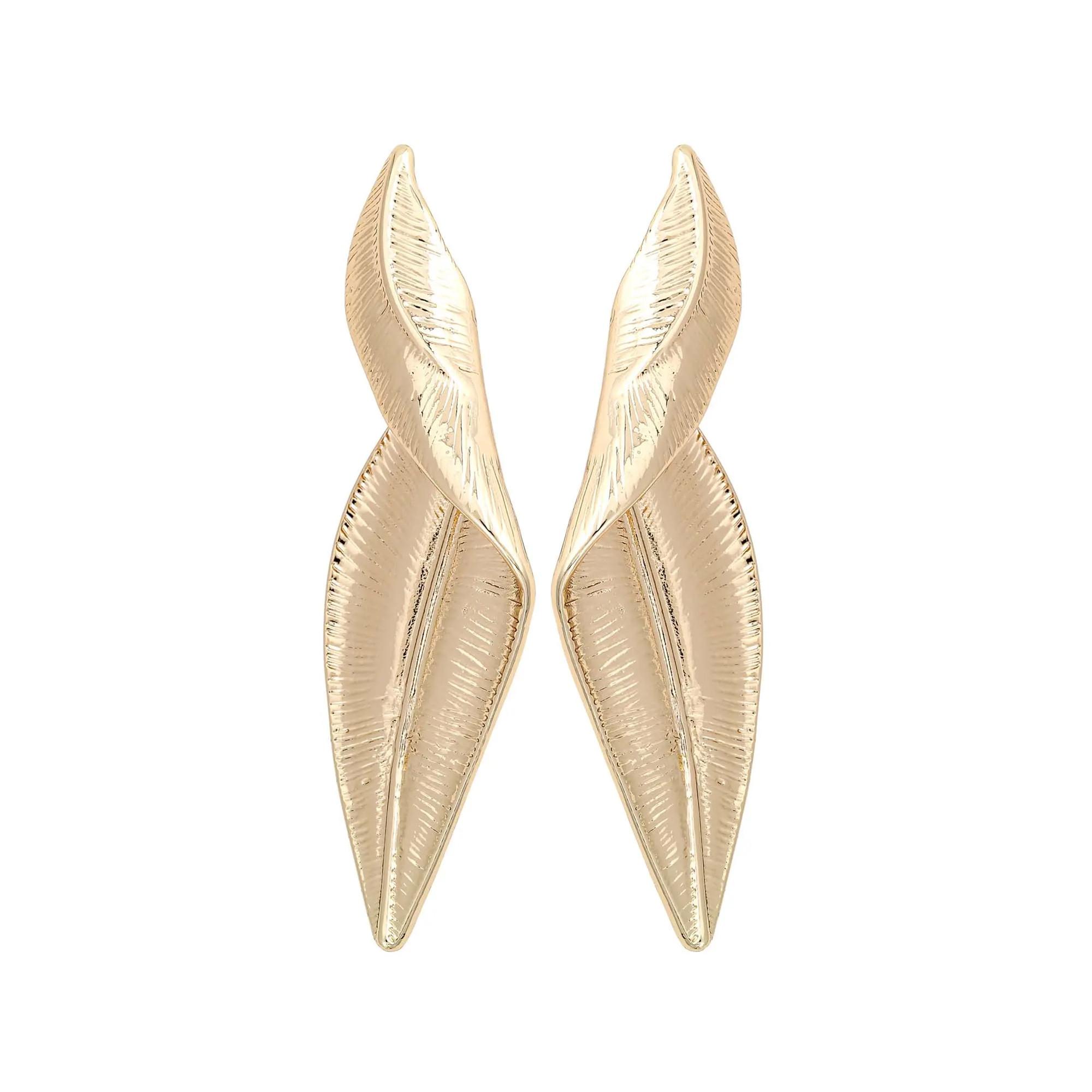 Les puces d'oreilles - Twisted Leaves sont dorées et ont la forme de feuilles allongées. Les feuilles sont torsadées. Ces boucles d'oreilles statement sont un véritable accroche-regard et se combinent parfaitement avec d'autres bijoux.