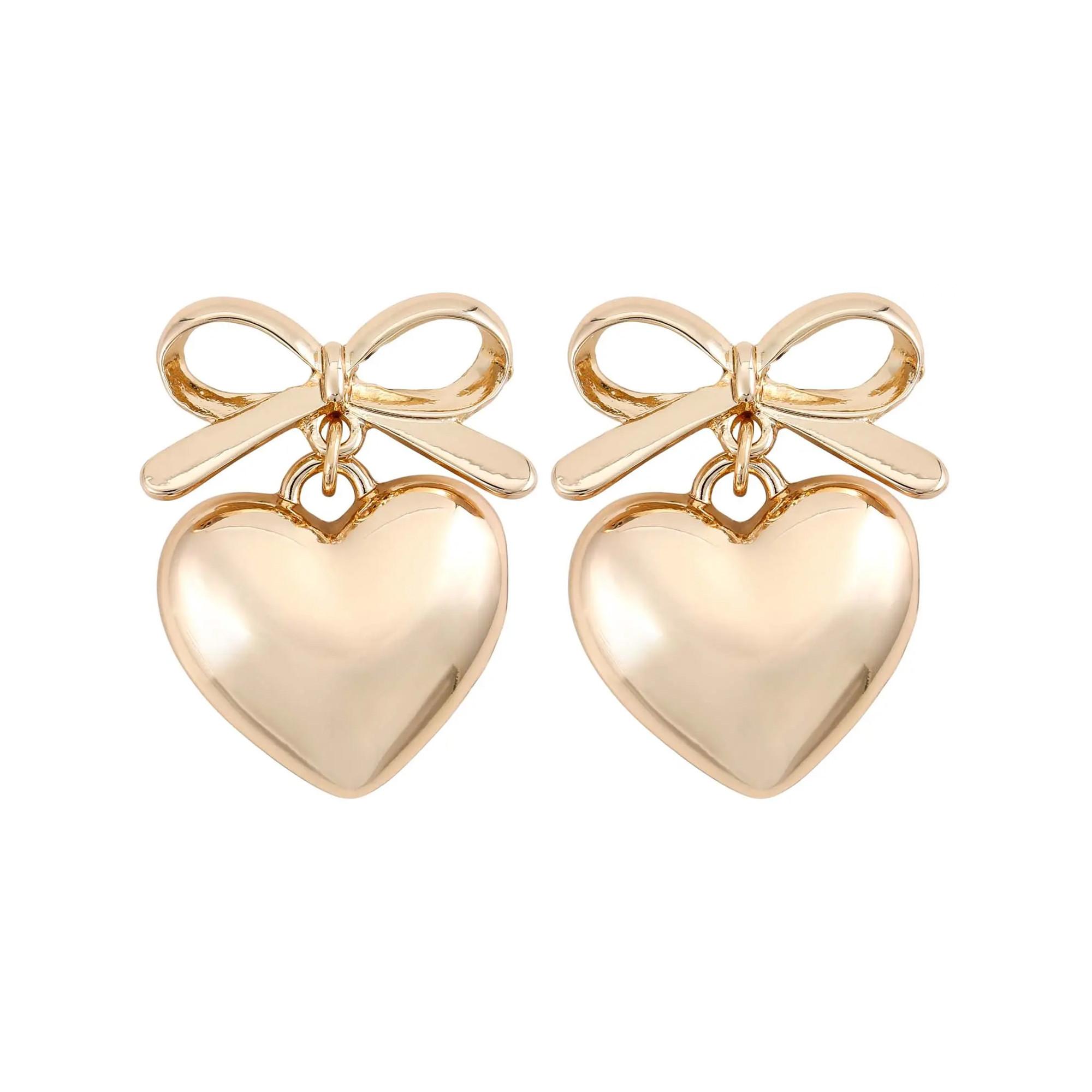Les puces d'oreilles - Bow Heart sont dorées et composées à 90 % de zinc recyclé. La tige a la forme d'un nœud avec un cœur en pendentif.