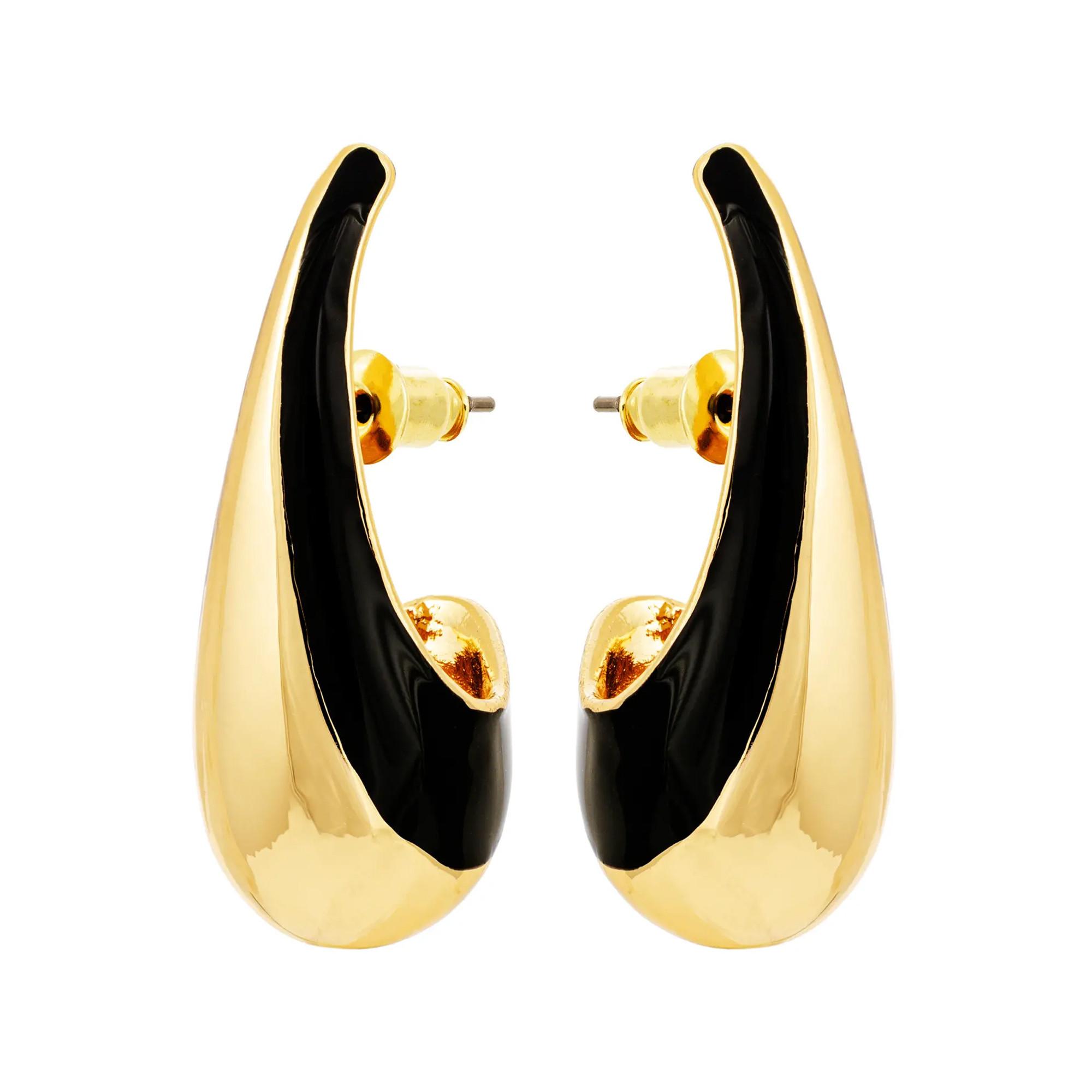 Les puces d'oreilles - Black Stripe sont dorées et ont la forme de gouttes allongées. Les boucles d'oreilles sont décorées d'une élégante bande noire sur le bord.