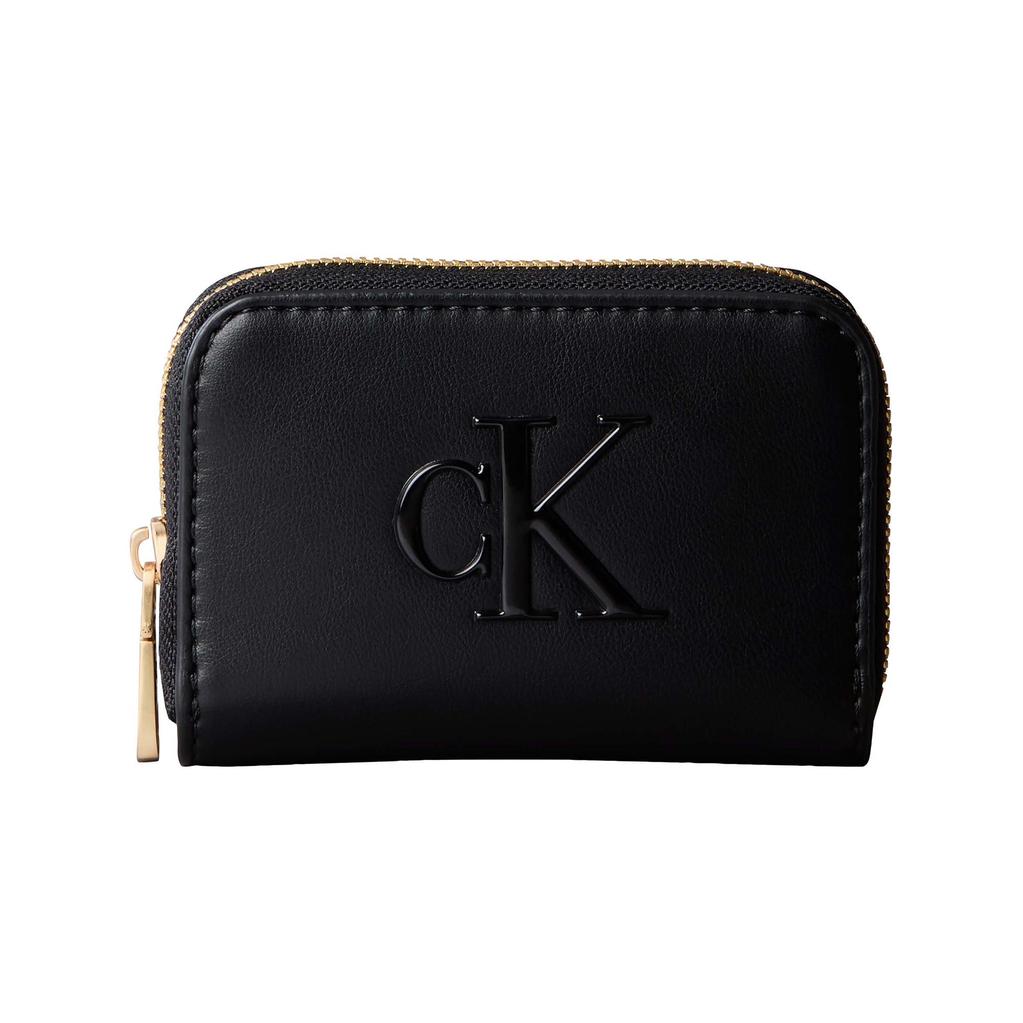 Ce portefeuille compact présente un design élégant avec un logo Calvin Klein proéminent en relief sur le devant. Il est conçu pour un usage quotidien, offrant un rangement pratique pour les cartes et l'argent liquide.