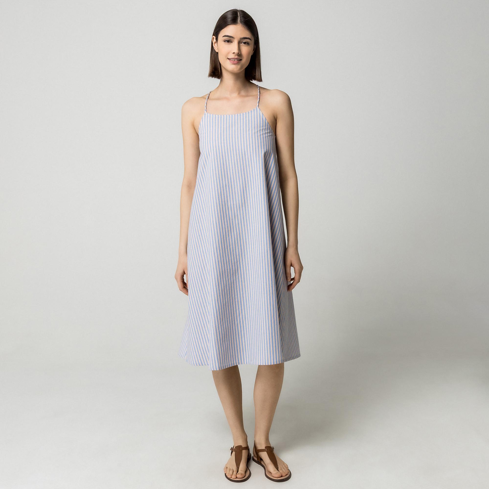 Cette robe décontractée arbore un charmant motif rayé, parfait pour un look à la fois décontracté et élégant. Le design comprend de fines bretelles spaghetti qui se croisent dans le dos, créant un dos ouvert avec une fermeture à nouer pour un ajustement réglable et confortable. La robe présente une silhouette trapèze décontractée qui tombe gracieusement juste en dessous du genou, offrant une liberté de mouvement et une forme flatteuse.