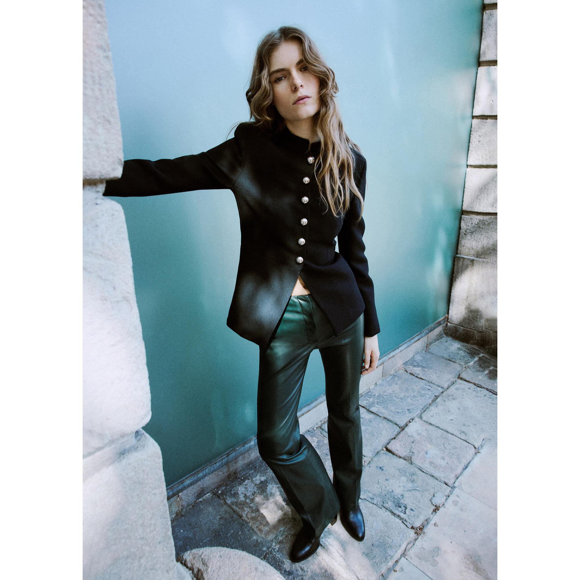 Ce pantalon évasé à effet cuir est une pièce tendance pour des tenues élégantes et modernes. Il se distingue par sa coupe évasée, sa taille haute et son tissu lisse à l’aspect cuir. Idéal à associer avec des blouses ou des mailles pour un look chic.