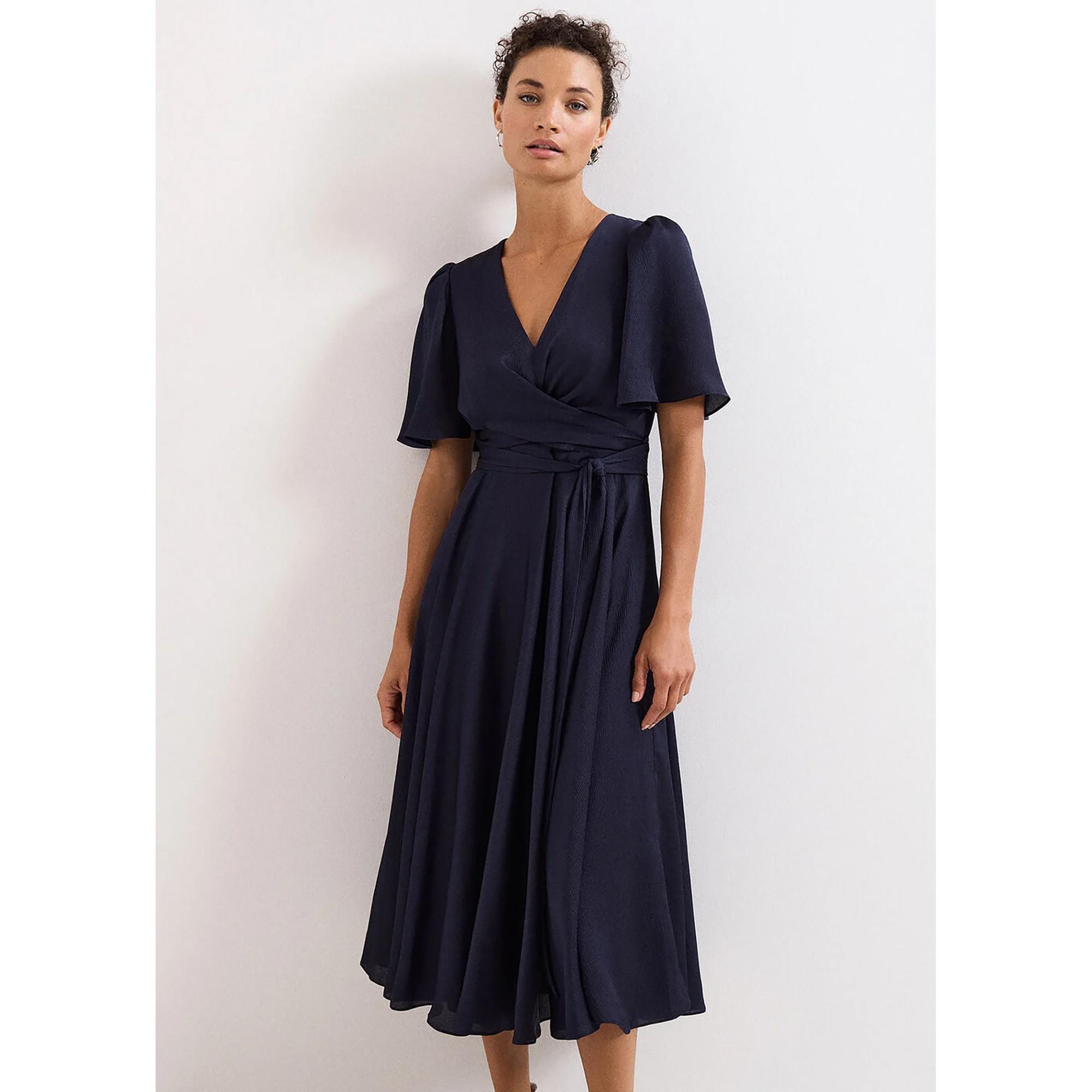 Cette robe midi portefeuille présente un décolleté en V flatteur et d'élégantes manches courtes volantées. La taille est cintrée par une ceinture à nouer, créant une silhouette gracieuse. La robe est conçue avec une longueur midi, ce qui la rend adaptée à diverses occasions.