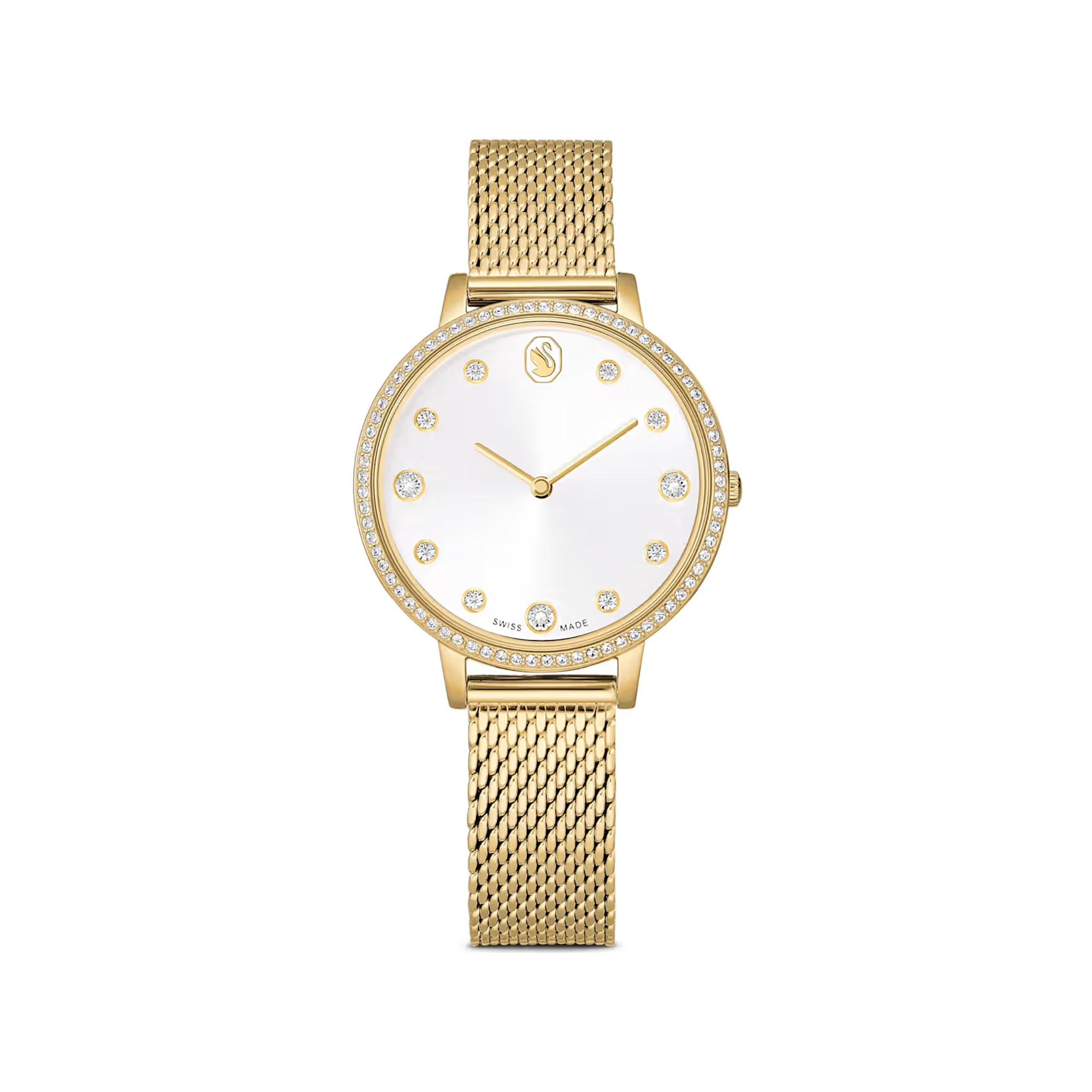 Cette montre Clarica élégante se distingue par son bracelet milanais signature, qui offre un style mesh saisissant autour du poignet. Le modèle de 35 mm est fabriqué en acier inoxydable avec une finition dorée et présente une lunette parfaitement circulaire sertie de 73 cristaux transparents. Sur le cadran à effet soleillé, la montre affiche 11 index en cristal et un emblème cygne à 12 heures. Cette montre Swiss Made est étanche jusqu’à 50 m et constitue un choix classique pour un luxe au quotidien.