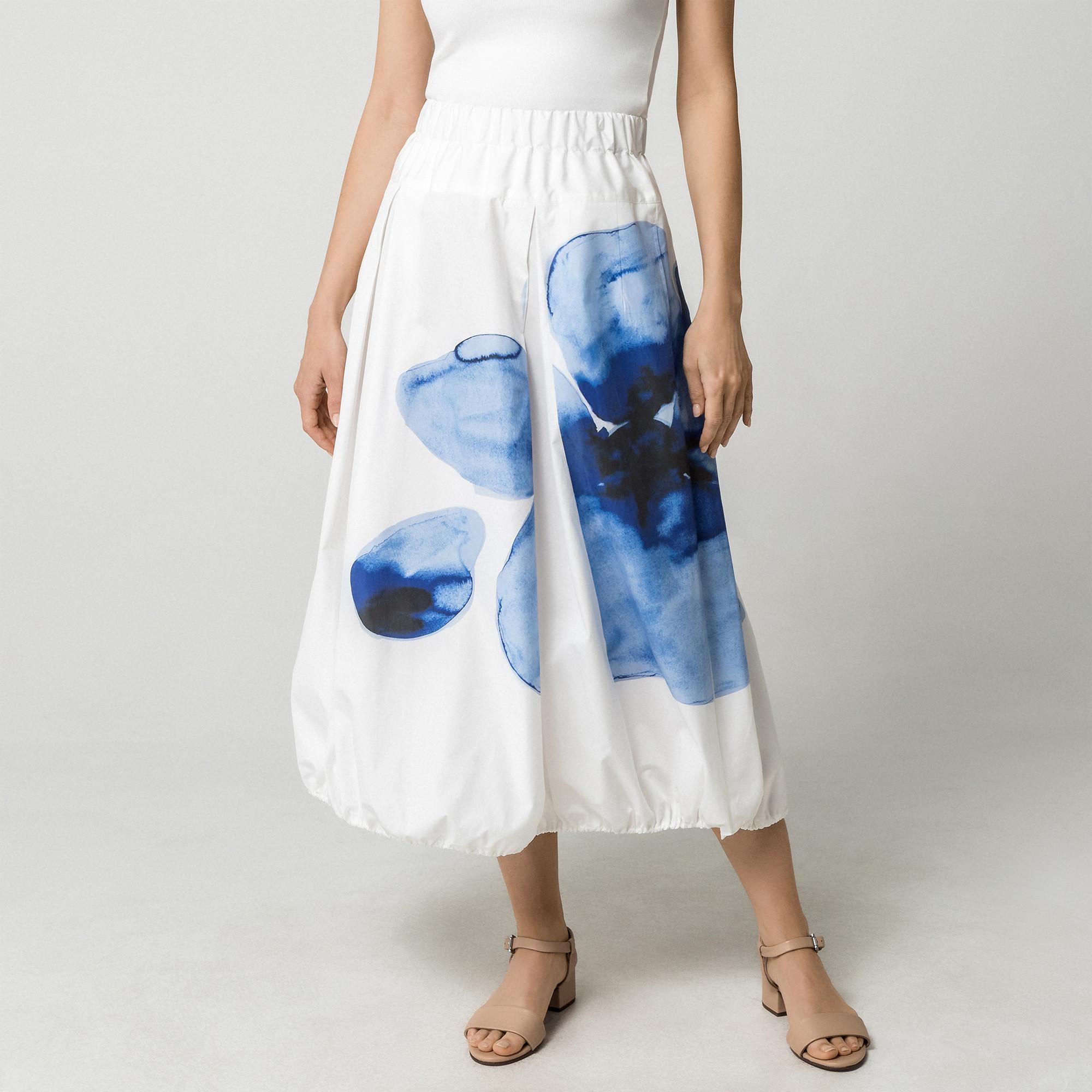 Cette jupe midi arbore un imprimé bleu et blanc saisissant, apportant une touche moderne et artistique à toute garde-robe. Le design comprend une taille élastiquée pour le confort et un ourlet froncé qui crée une silhouette unique et volumineuse.