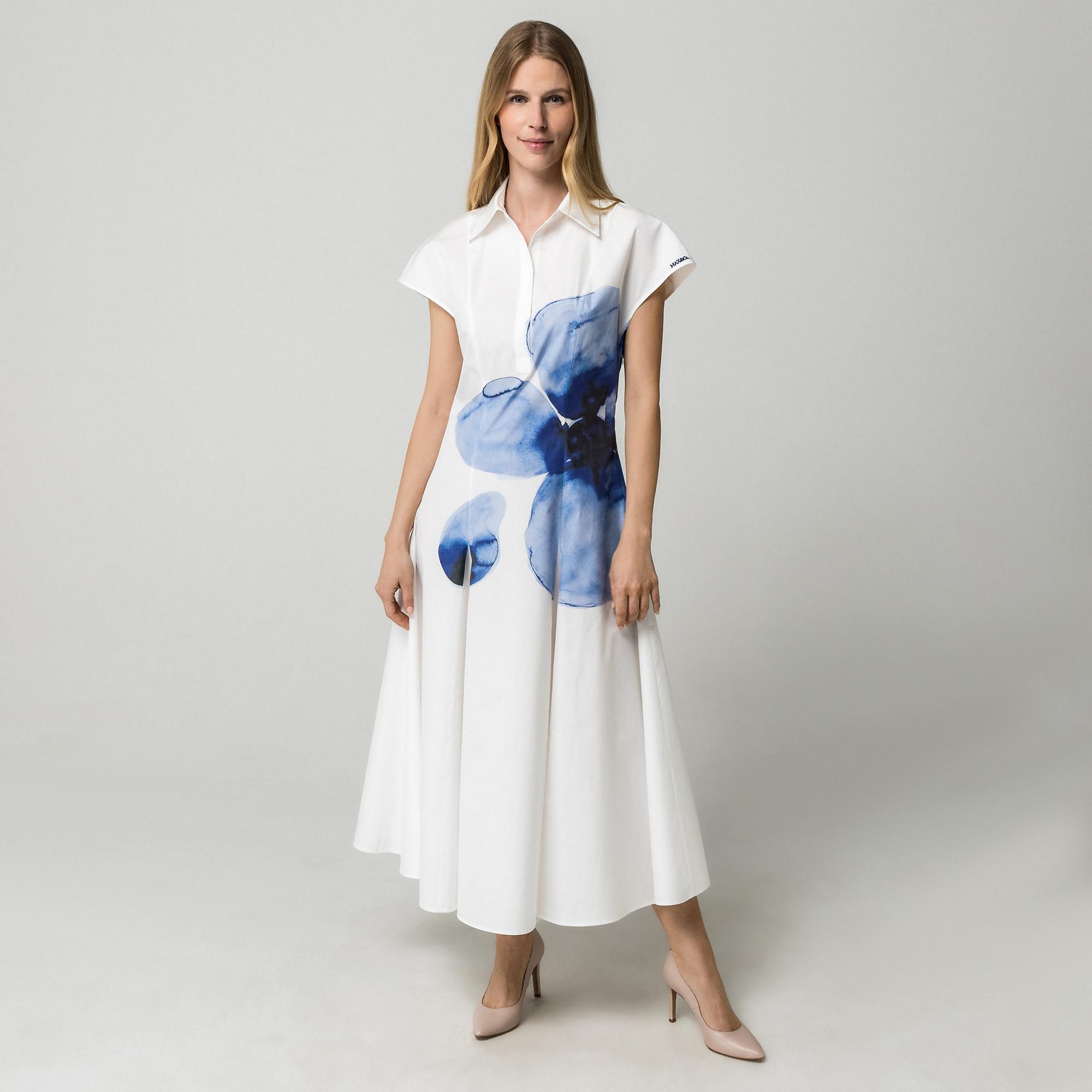 Cette robe chemise midi présente un col classique et des manches courtes, offrant une silhouette intemporelle. La robe est ornée d'un imprimé floral bleu saisissant, ajoutant une touche d'élégance artistique au design. La patte de boutonnage sur toute la longueur offre une finition soignée, tandis que la jupe évasée assure un mouvement confortable et un drapé gracieux.
