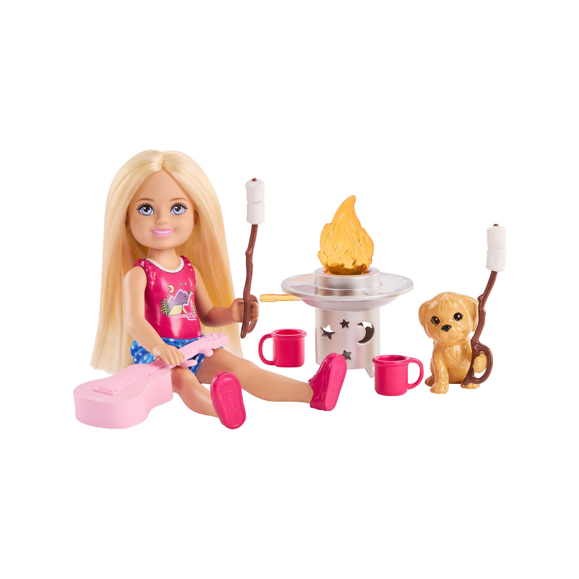 La poupée Chelsea et son chien aiment la nature Cet ensemble de jeu Barbie Family & Friends est placé sous le signe de l’envie d’aventure avec un thème de camping. L’aventure de Chelsea dans la nature inspire de belles histoires avec une petite poupée,