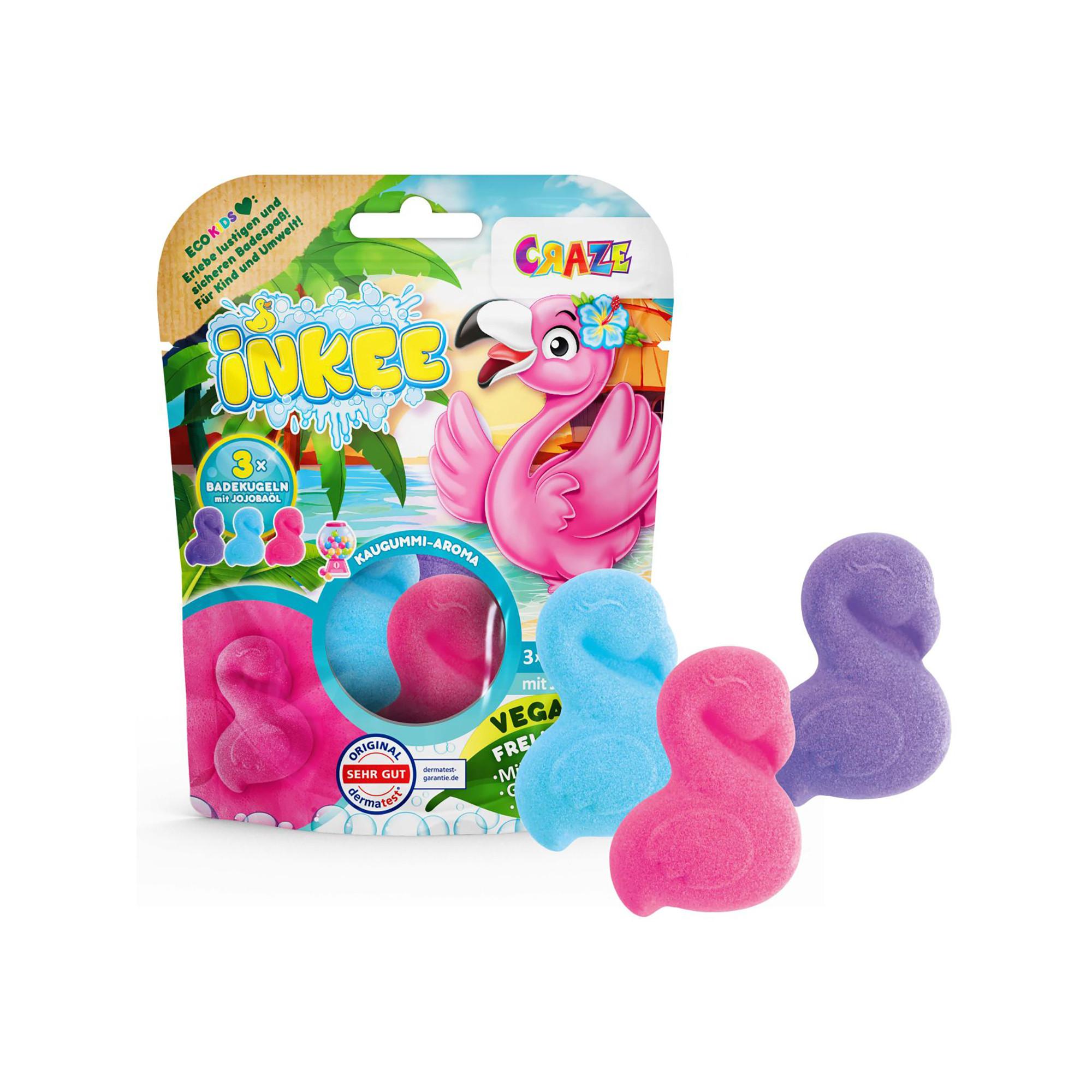 Waouh ! Quel parfum de chewing-gum, quelle mousse et quelles belles couleurs ! Le multipack INKEE Flamingo de CRAZE transforme l'eau en un bain moussant coloré et pétillant. Le multipack contient 3 boules de bain colorées en forme de flamant rose de 55 g chacune. Dermatest EXCELLENT.