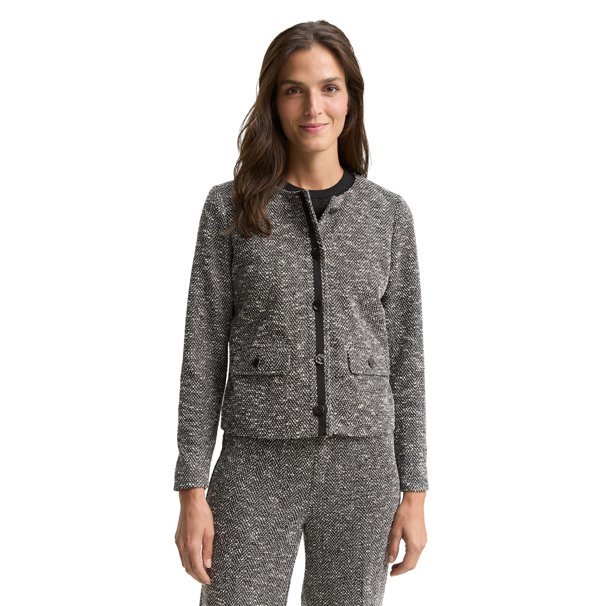 Cette veste en tweed offre un look intemporel et sophistiqué. Elle est dotée d'un col montant et d'une patte de boutonnage avec une bordure contrastante, ajoutant une touche raffinée au design. La veste est complétée par deux poches plaquées, alliant style et praticité.