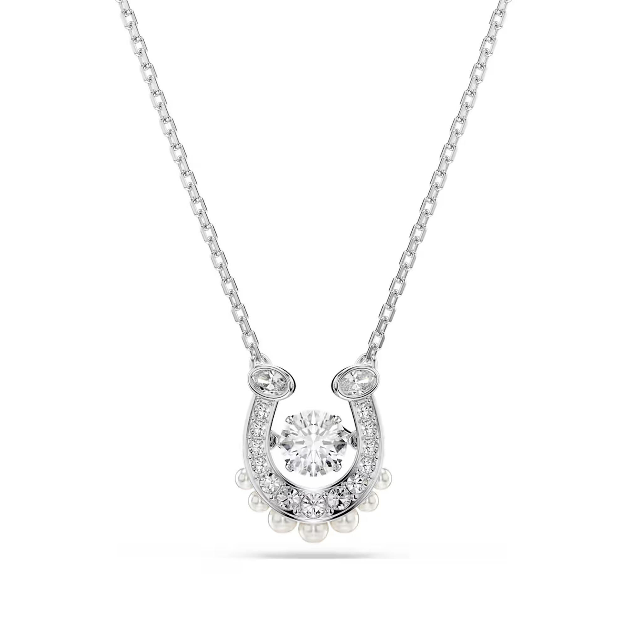 Maximisez votre éclat avec ce pendentif fer à cheval significatif. Le motif plaqué rhodium est décoré de cristaux clairs et de micro-perles Swarovski Crystal, tandis que le centre du design révèle une Dancing Stone facettée qui crée un merveilleux jeu de lumière. Portez ce pendentif vous-même ou offrez-le à quelqu’un de spécial comme symbole de chance et de succès.