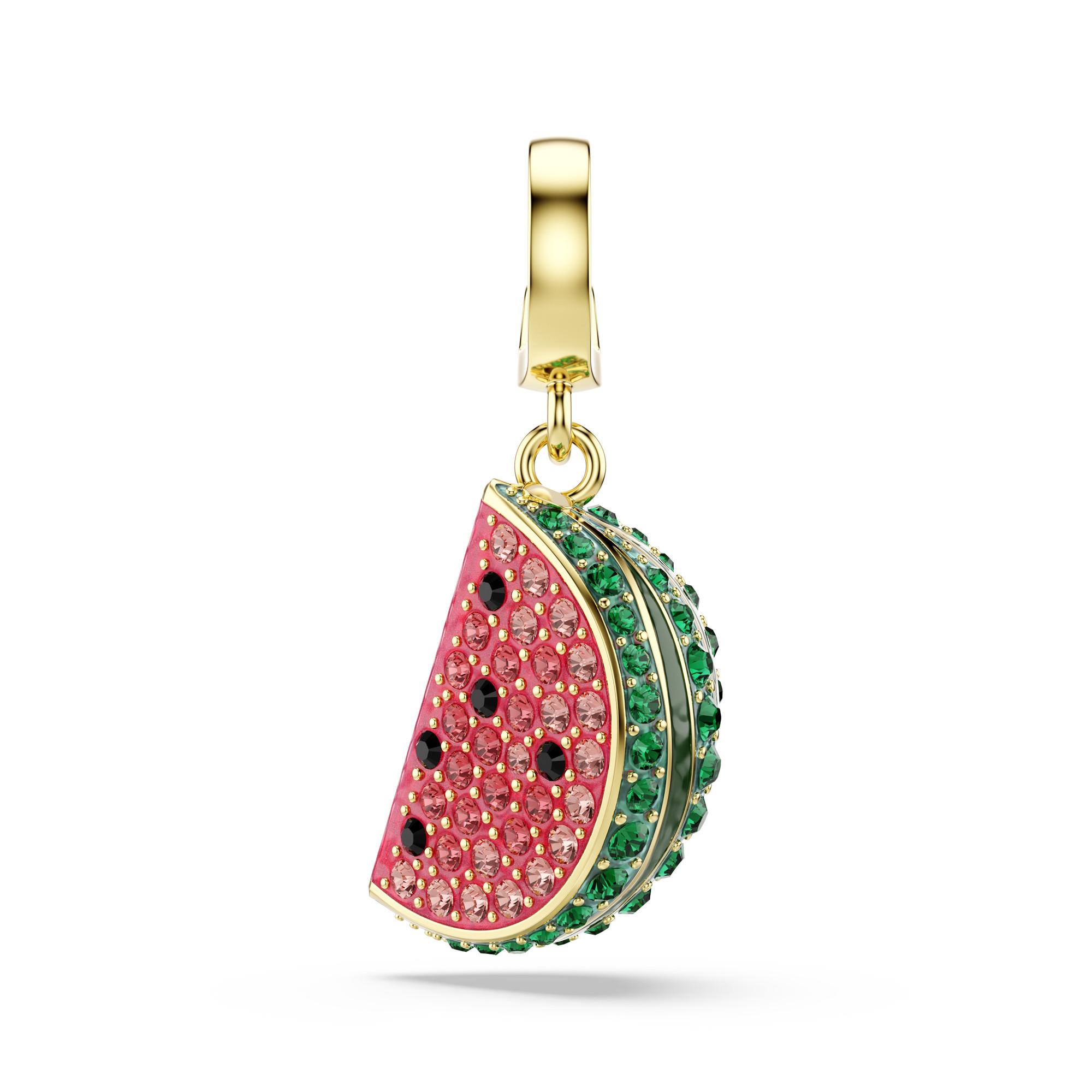 Apportez une touche personnelle à votre style quotidien avec les charms Swarovski, compatibles avec plusieurs bijoux des collections Matrix, Una et Idyllia. Ce morceau de pastèque est idéal pour tous ceux qui aiment l’été. Le design en alliage doré est orné de pavé de cristaux roses et verts ainsi que de pépins réalistes en cristaux Swarovski ReCreated™ noirs. Grâce à sa fermeture innovante, le charm peut être porté sur différents colliers et bracelets.