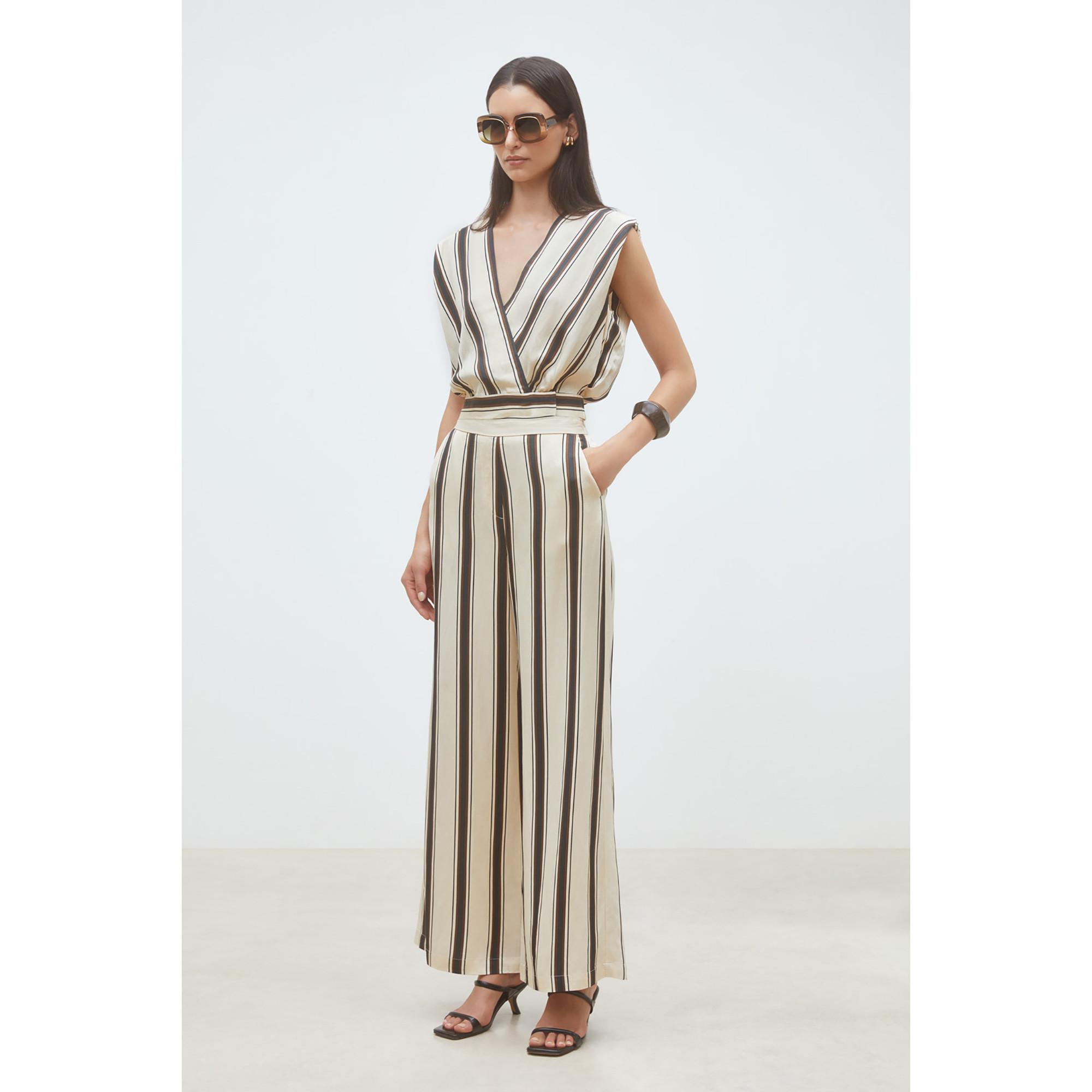 Ce chemisier présente un motif rayé élégant et un décolleté en V flatteur, ce qui en fait un ajout polyvalent à toute garde-robe. Le design comprend un devant style cache-cœur qui crée une silhouette chic.