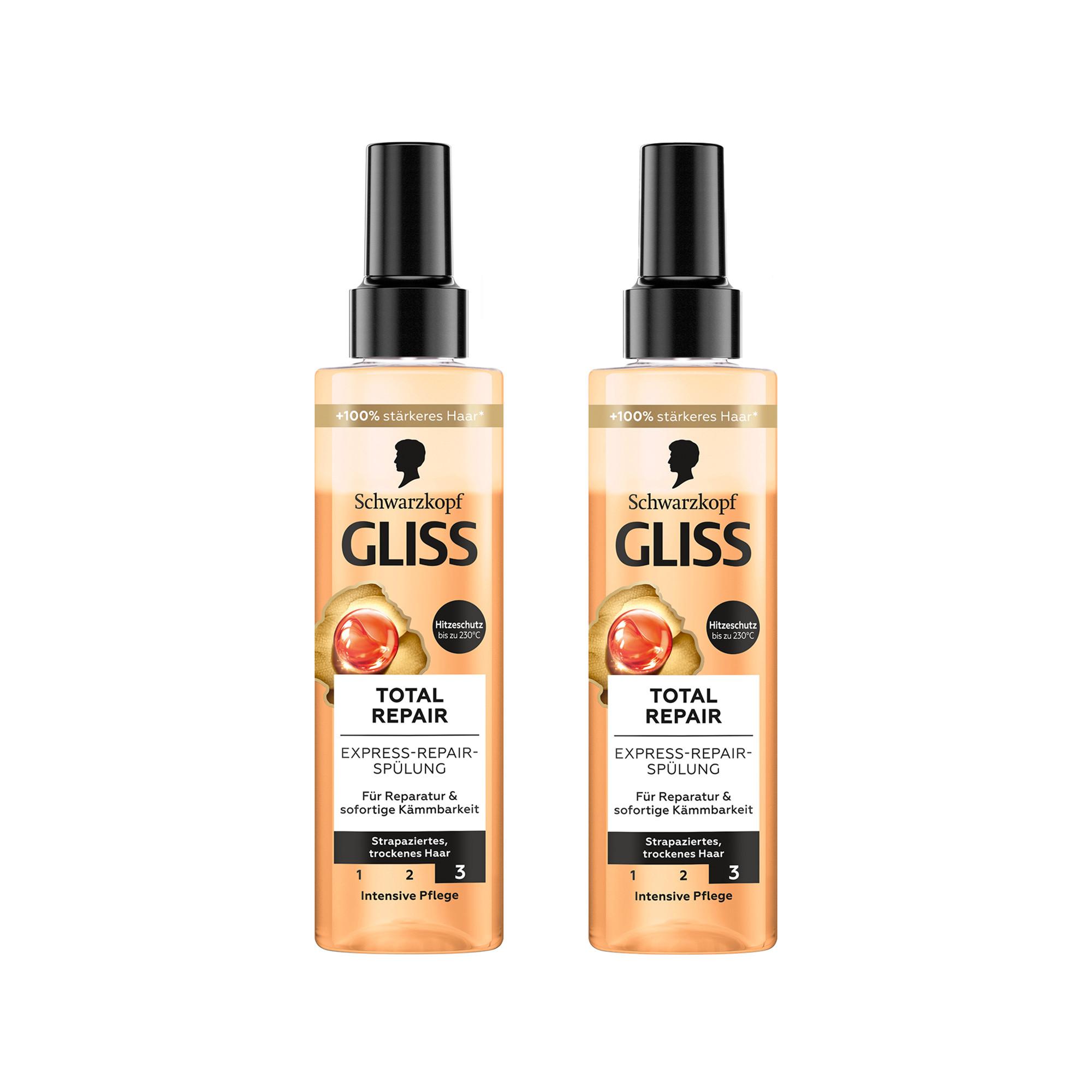L'après-shampooing Gliss Express-Repair Total Repair assure un démêlage immédiat et une protection contre la casse, avec une protection thermique jusqu'à 230 °C.