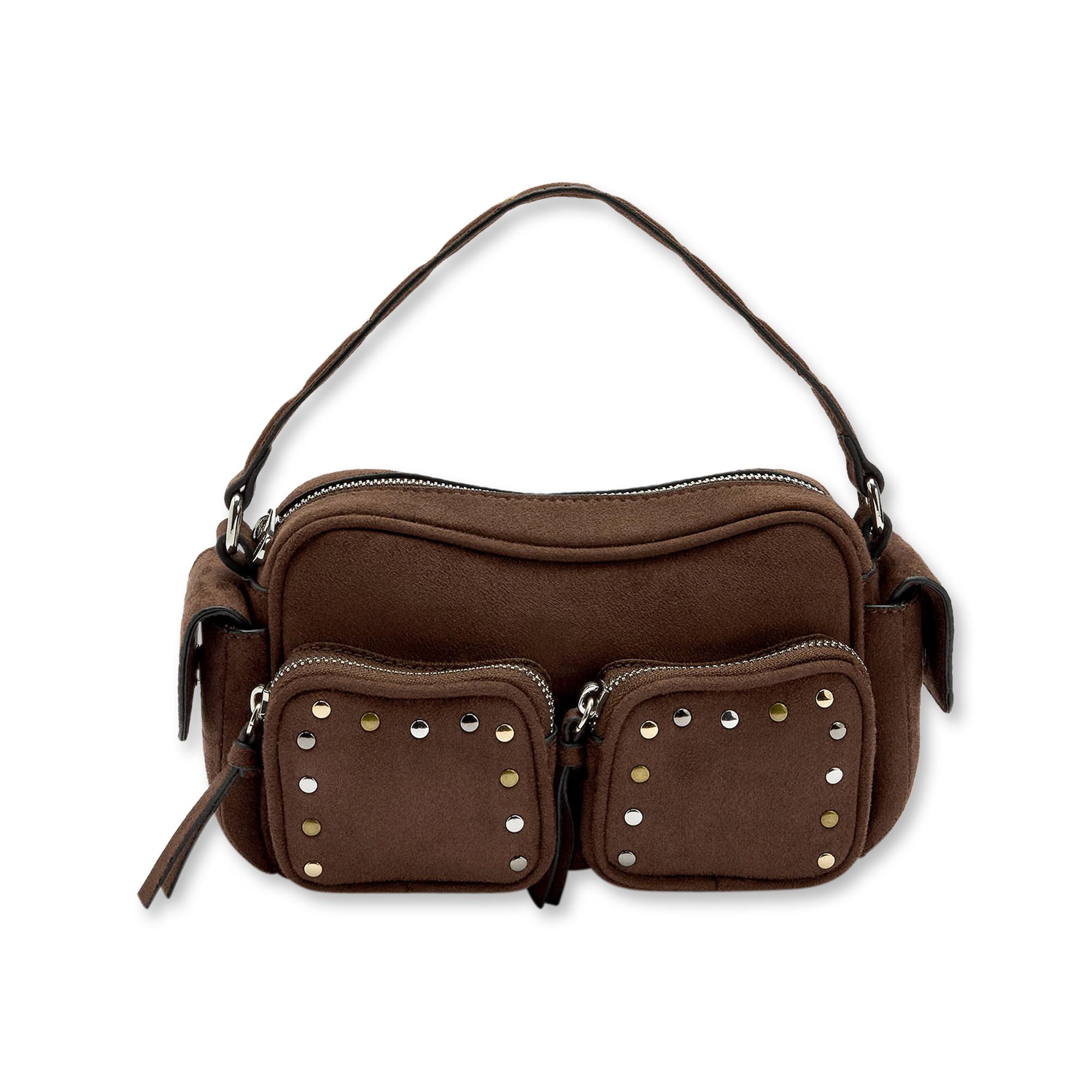 Ce sac à main présente un design élégant avec plusieurs compartiments pour un rangement organisé. Le compartiment principal et les poches avant sont sécurisés par des fermetures éclair, et les poches avant sont ornées de clous décoratifs, ajoutant une touche de sophistication audacieuse. Il comprend à la fois une poignée courte et une longue bandoulière réglable, offrant des options de transport polyvalentes.