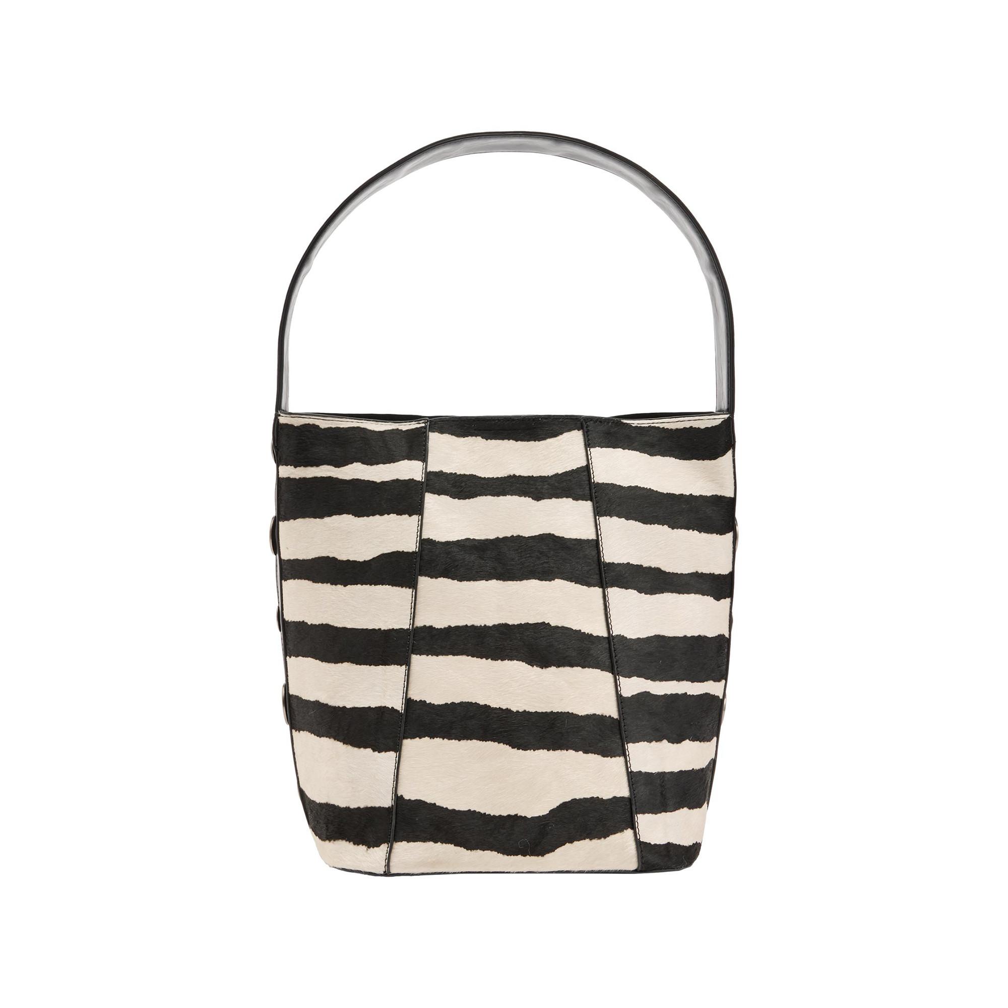 Ce sac seau présente un imprimé zèbre saisissant d'un côté et un design noir uni de l'autre, offrant des options de style polyvalentes. Le sac est équipé d'une poignée supérieure robuste pour un transport confortable et de détails de boutons argentés sur les côtés, ajoutant une touche de modernité.
