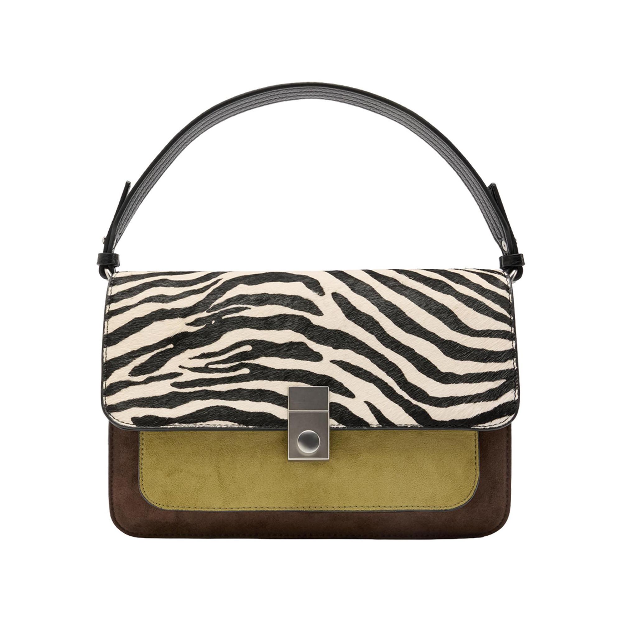 Ce sac à main présente un design distinctif avec un rabat imprimé zèbre, offrant un accessoire audacieux et élégant. Le sac combine différentes textures et couleurs pour un look unique, parfait pour les fêtes et les tenues décontractées.
