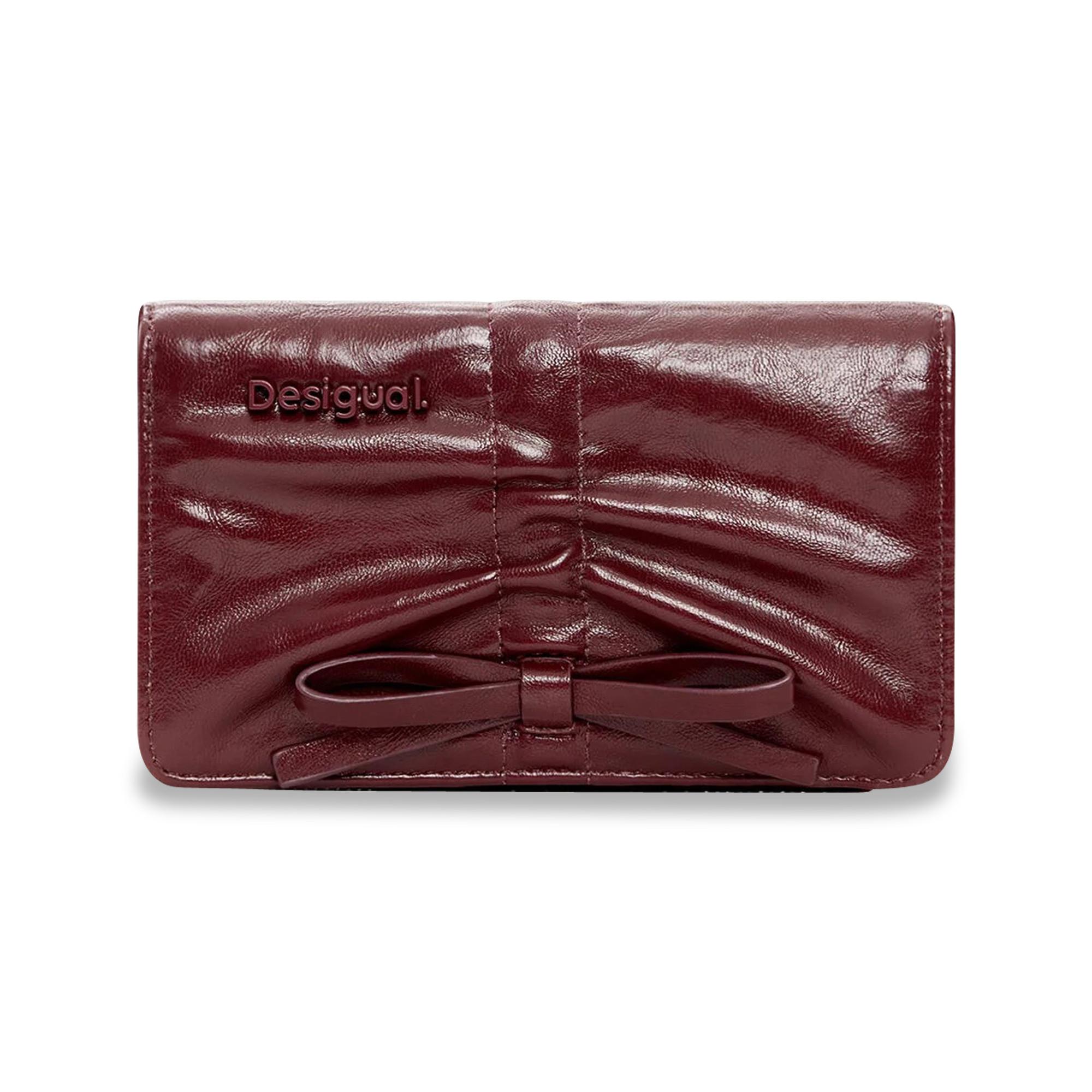 Cet élégant portefeuille présente un détail de nœud sophistiqué sur le devant, ajoutant une touche de charme à son design. La riche couleur bordeaux et la finition texturée en font un accessoire élégant pour un usage quotidien. C'est un portefeuille classique avec plusieurs compartiments, adapté à une utilisation toute l'année.