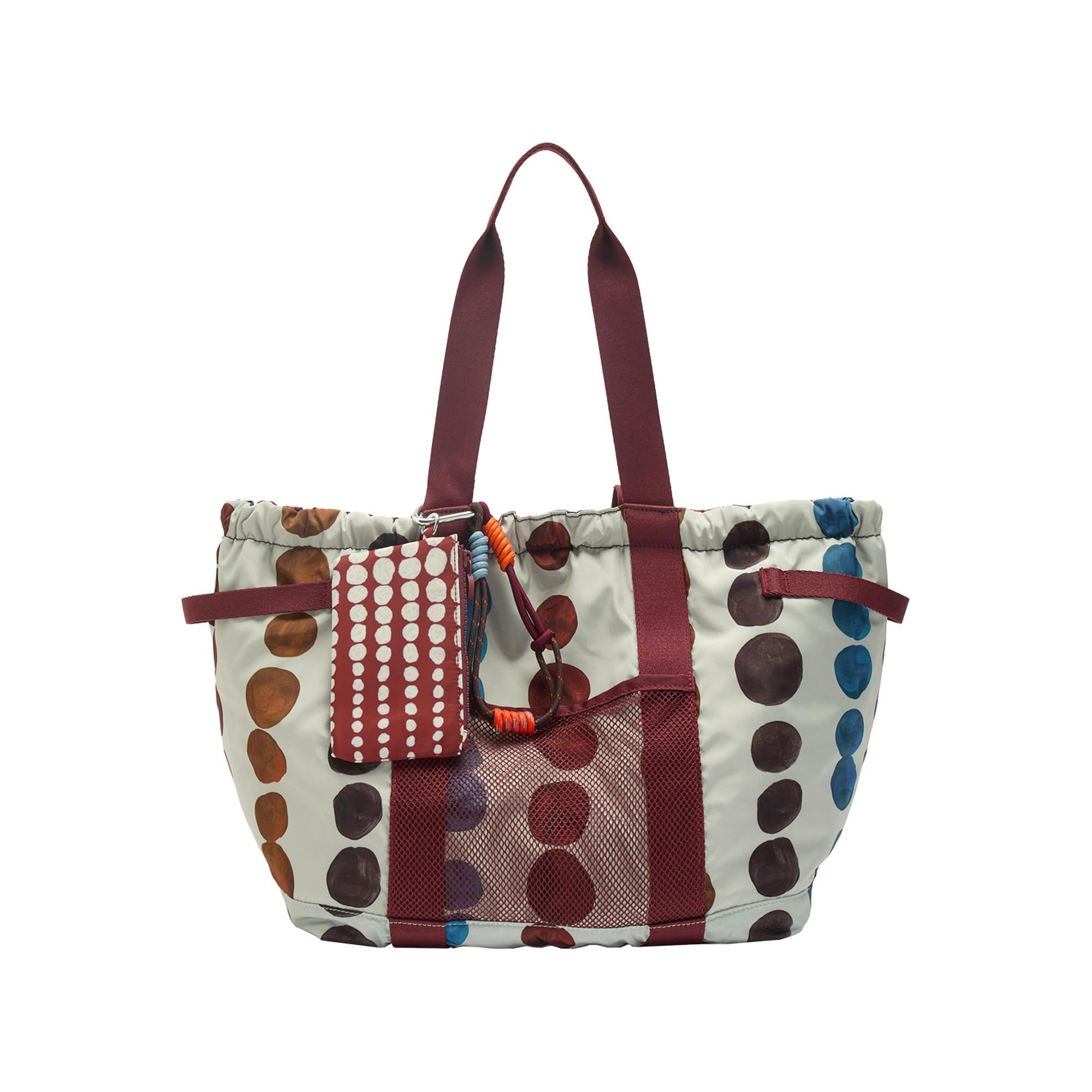 Ce sac de voyage réversible pour le week-end est fabriqué en nylon avec un motif circulaire imprimé. Il est doté d'une poche en filet, de cordons latéraux pour resserrer, d'une étiquette amovible et de bandoulières solides. Une sangle est incluse pour le fixer à un trolley, le rendant idéal pour les voyages.