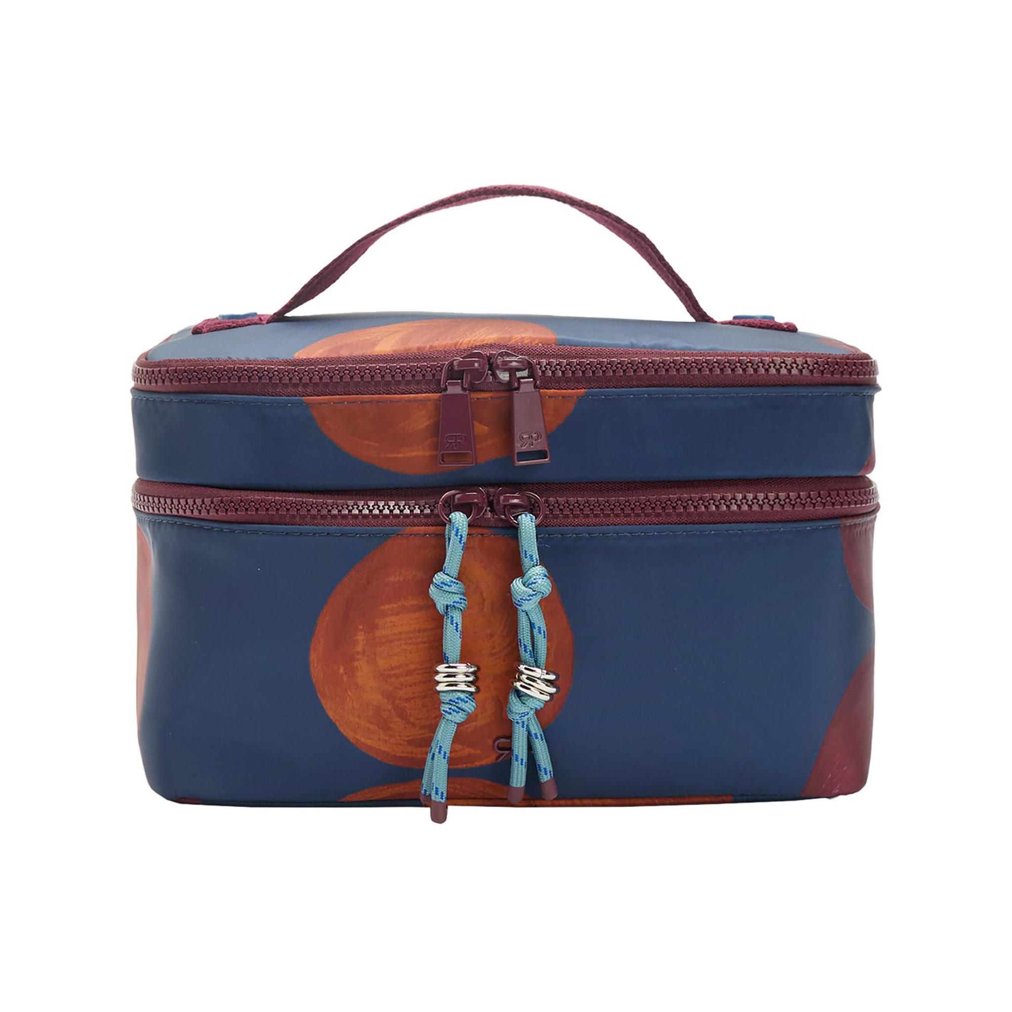 Trousse de toilette en nylon avec motif circulaire imprimé. Doublure et compartiments intérieurs de couleur contrastée. Compartiment supérieur. Fermetures à glissière avec détail ruban. Poignée supérieure fixe.