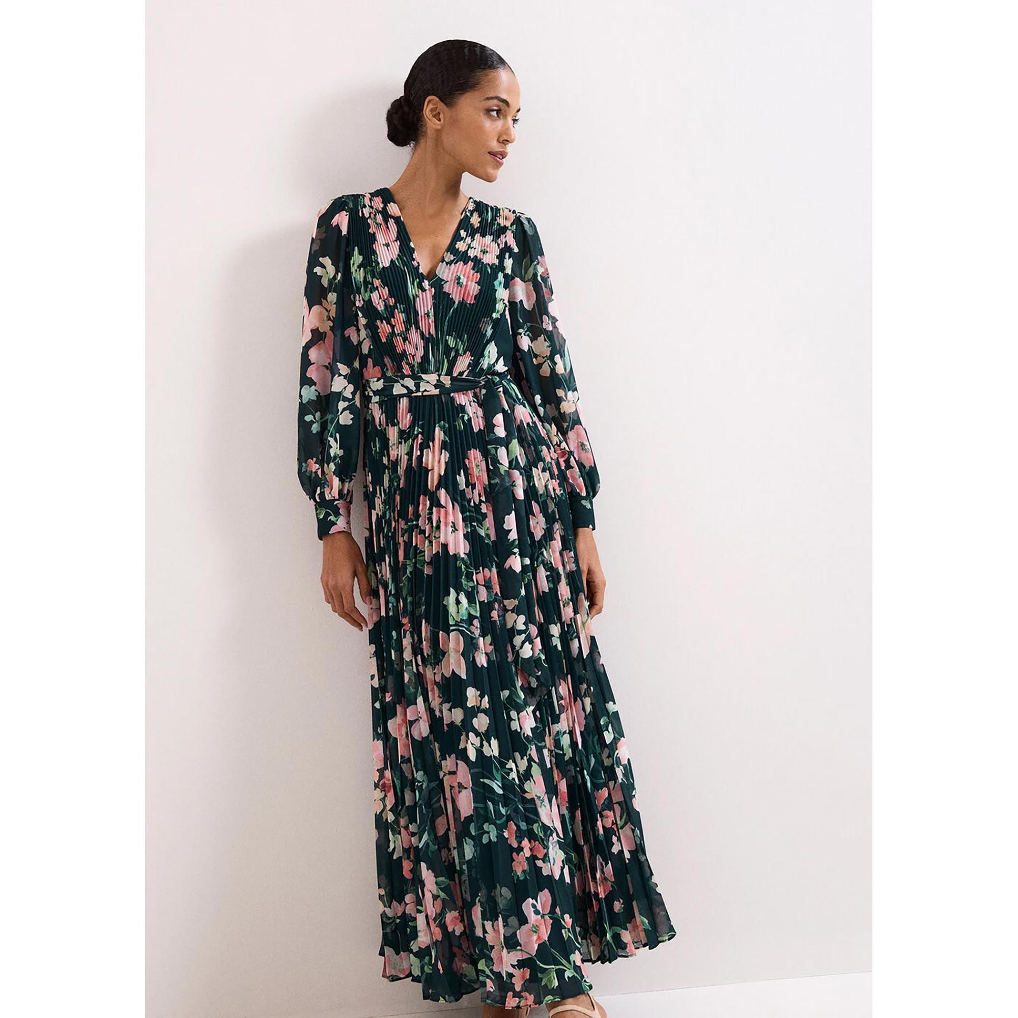 Cette élégante robe longue présente un magnifique motif floral et un design plissé flatteur. Le décolleté en V et les manches longues ajoutent à son attrait sophistiqué, la rendant adaptée à diverses occasions.