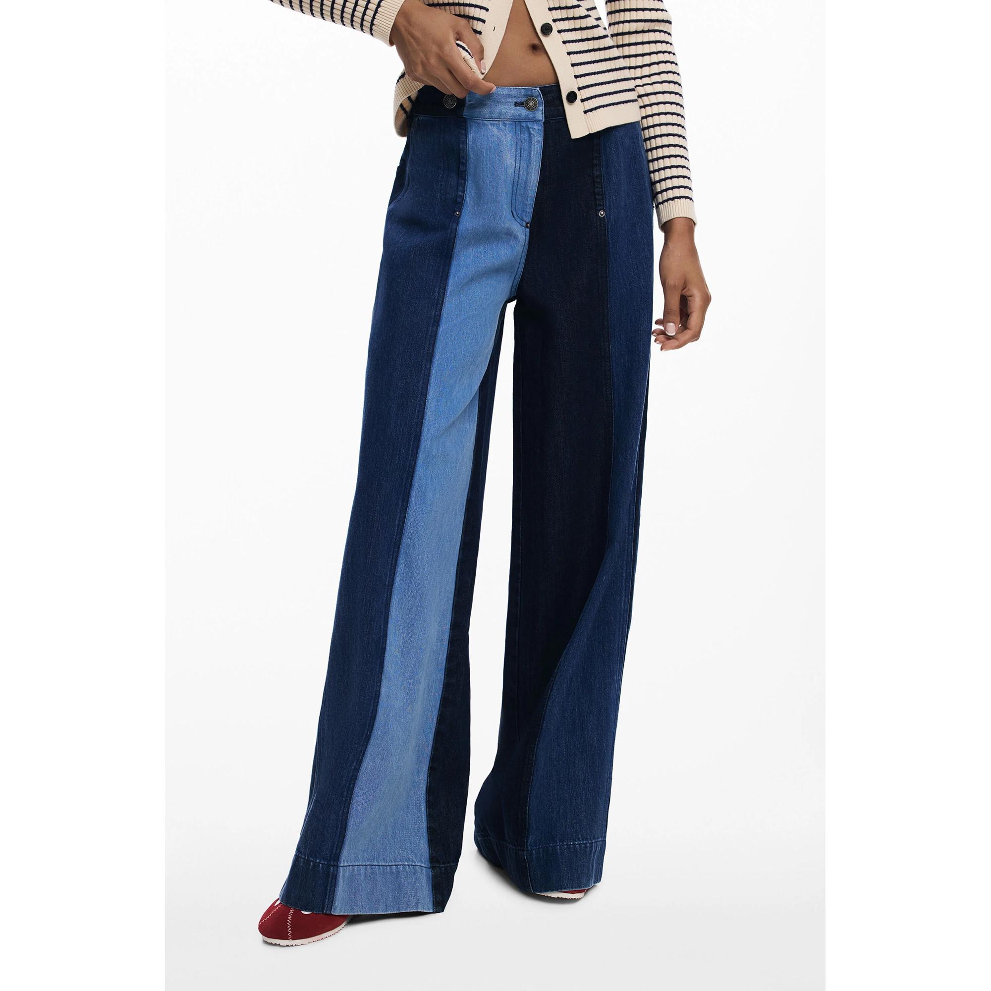 Ce jean à jambe large présente un design patchwork distinctif, combinant différentes nuances de denim pour un look unique et élégant. La taille haute offre une silhouette flatteuse, tandis que la jambe large procure confort et une esthétique moderne.
