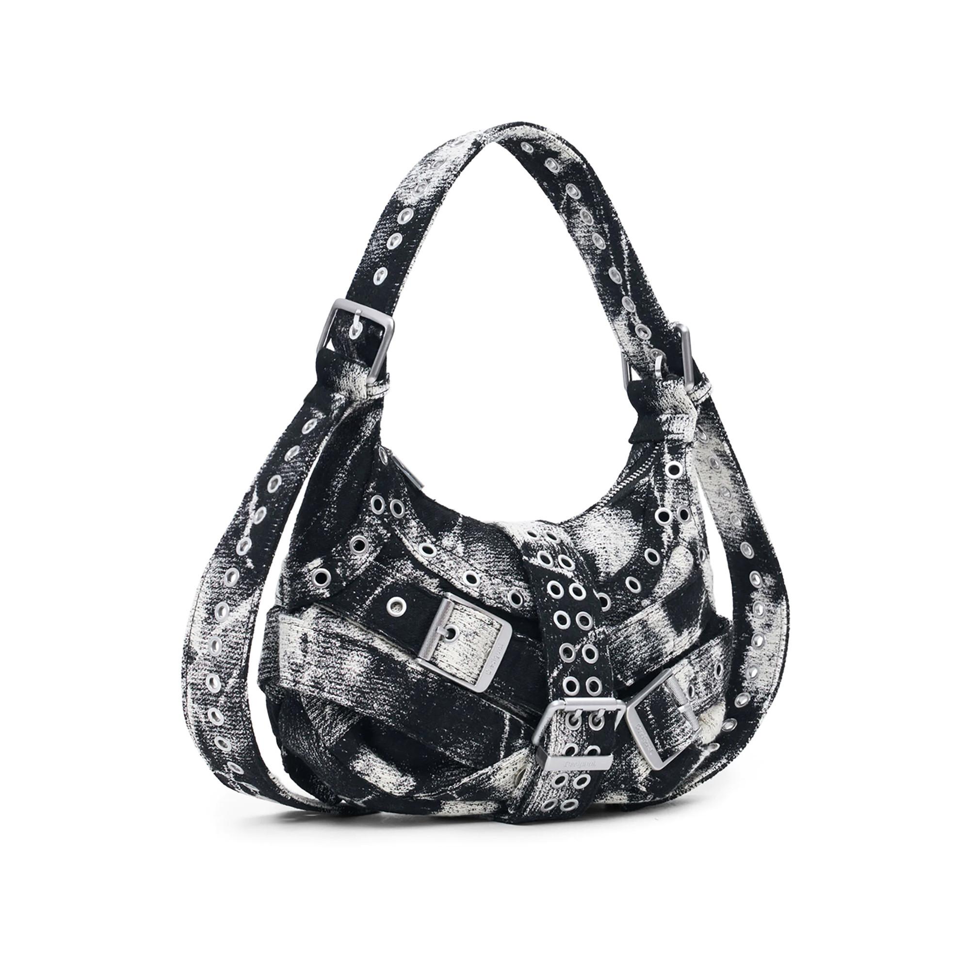 Ce sac à bandoulière présente un design unique avec un effet vieilli et délavé, ainsi que de nombreux œillets et boucles métalliques, lui conférant un look distinctif et audacieux. Le sac est conçu pour être porté confortablement à l'épaule, ce qui en fait un accessoire pratique pour un usage quotidien ou pour ajouter une touche affirmée à une tenue.