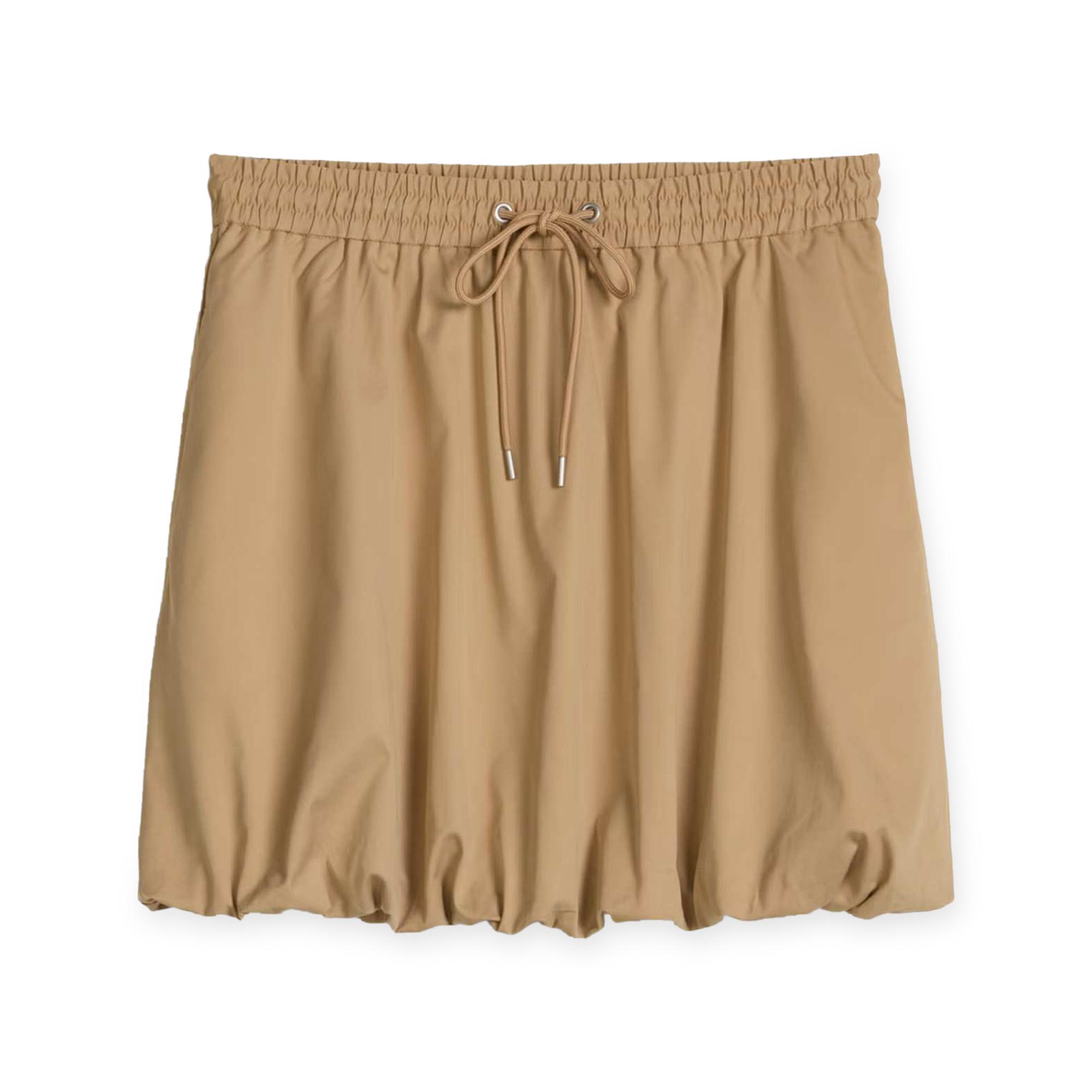 Cette mini-jupe est dotée d'une taille élastique confortable avec un cordon de serrage décoratif, offrant une coupe décontractée mais élégante. Le design comprend des poches latérales pratiques et un ourlet froncé, ajoutant un volume subtil à la silhouette.