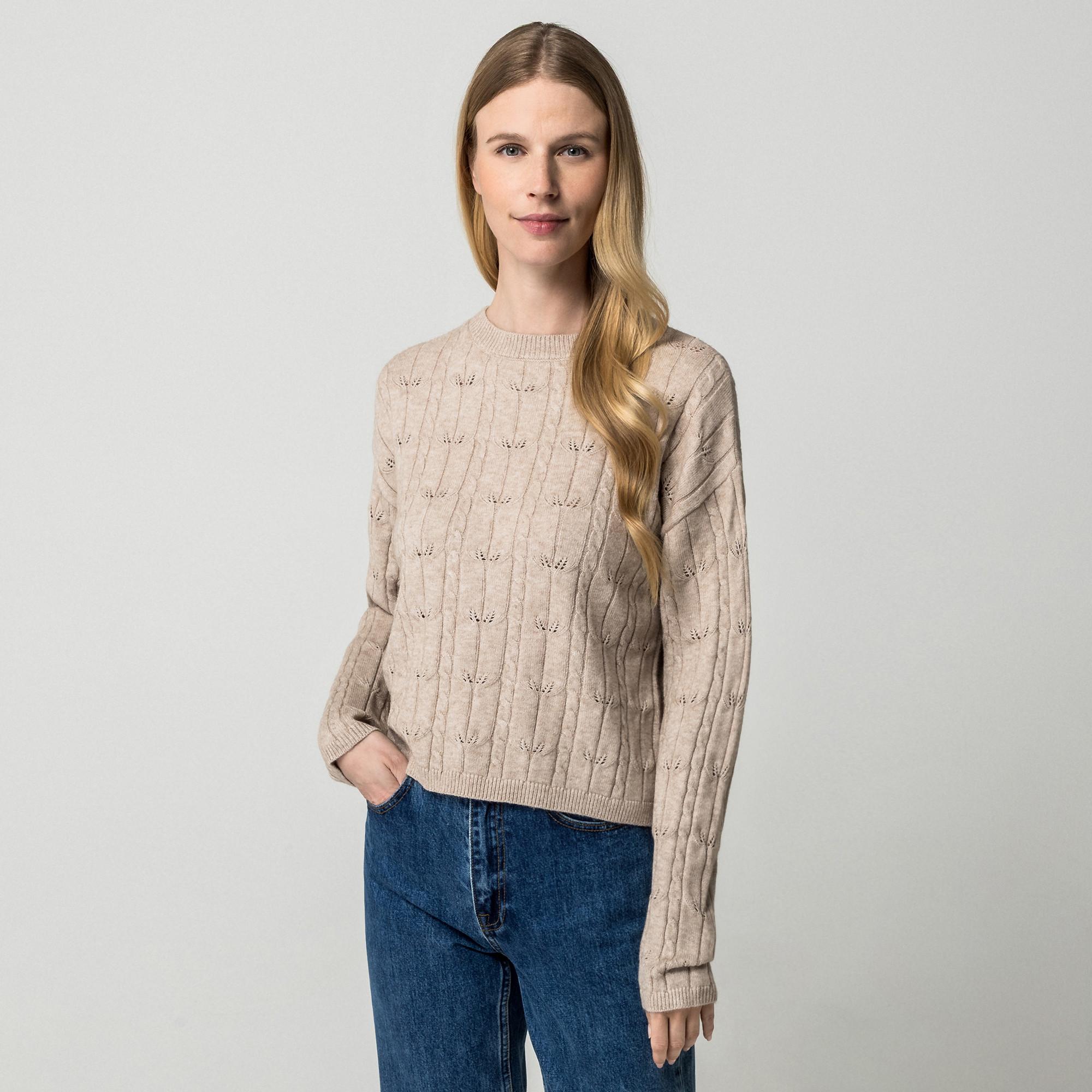 Ce pull en maille torsadée présente un design classique avec un col rond et des manches longues. Le motif en maille torsadée complexe ajoute de la texture et un intérêt visuel au vêtement, en faisant une pièce polyvalente pour diverses occasions.