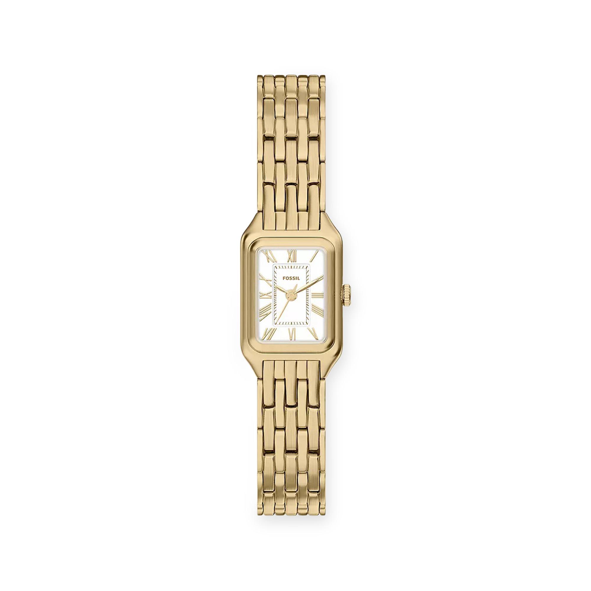Un boîtier et un bracelet en acier inoxydable doré offrent un look polyvalent et raffiné. Le petit boîtier rectangulaire doré encadre un cadran blanc satiné, mis en valeur par un mouvement à trois aiguilles clair et constituant un détail discret. Le bracelet est équipé d’une double boucle déployante, garantissant un maintien sûr et confortable.