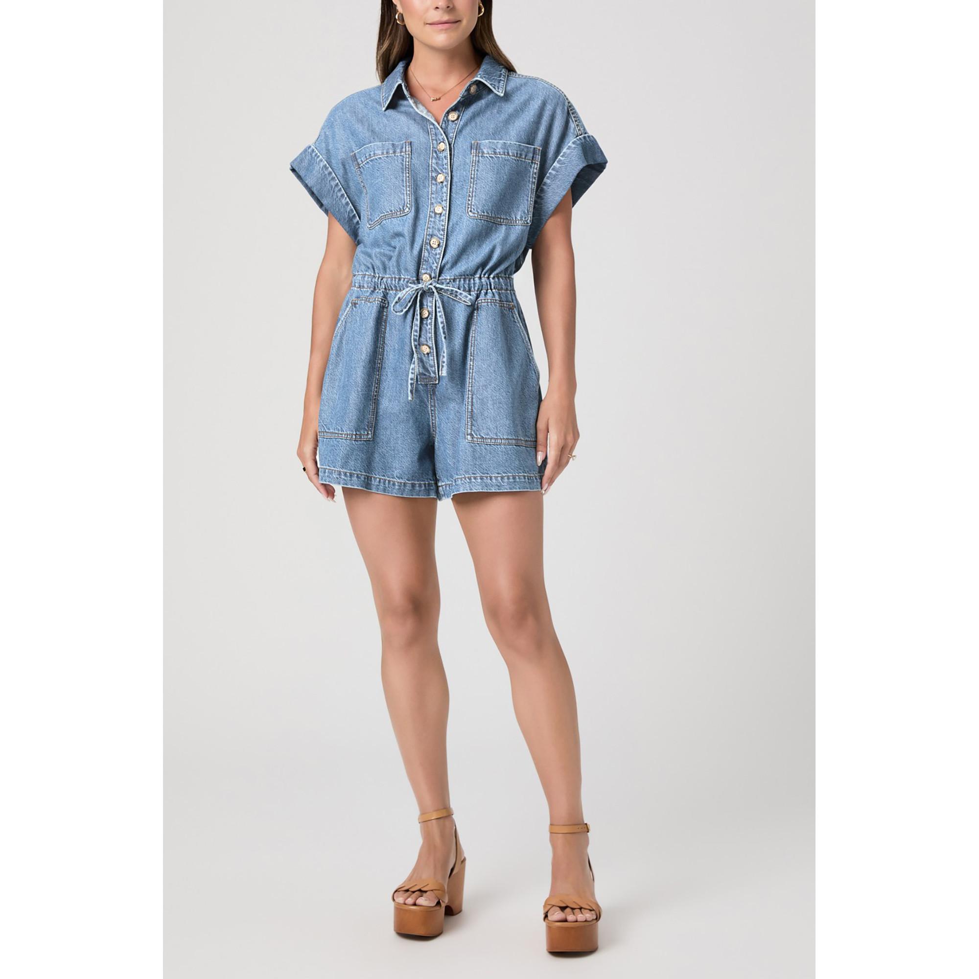 Cette combinaison courte en denim offre une option élégante et confortable pour diverses occasions. Le design présente un col classique et une patte de boutonnage sur toute la longueur, offrant une esthétique intemporelle. Les manches courtes et le cordon de serrage intégré à la taille améliorent la coupe et la silhouette globales.