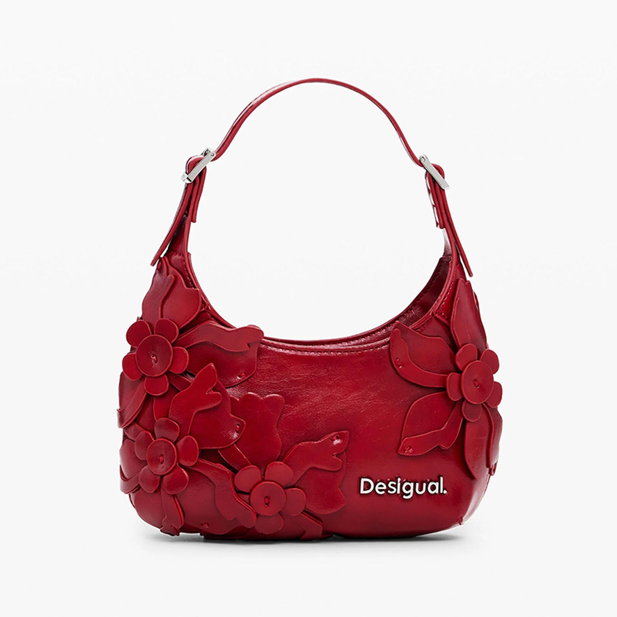 Ce sac à bandoulière présente une teinte rouge vibrante et est orné d'applications florales complexes, créant un design distinctif et accrocheur. La silhouette du sac est complétée par une bandoulière confortable, ce qui en fait un accessoire élégant pour diverses occasions. Le logo Desigual est subtilement intégré au design.