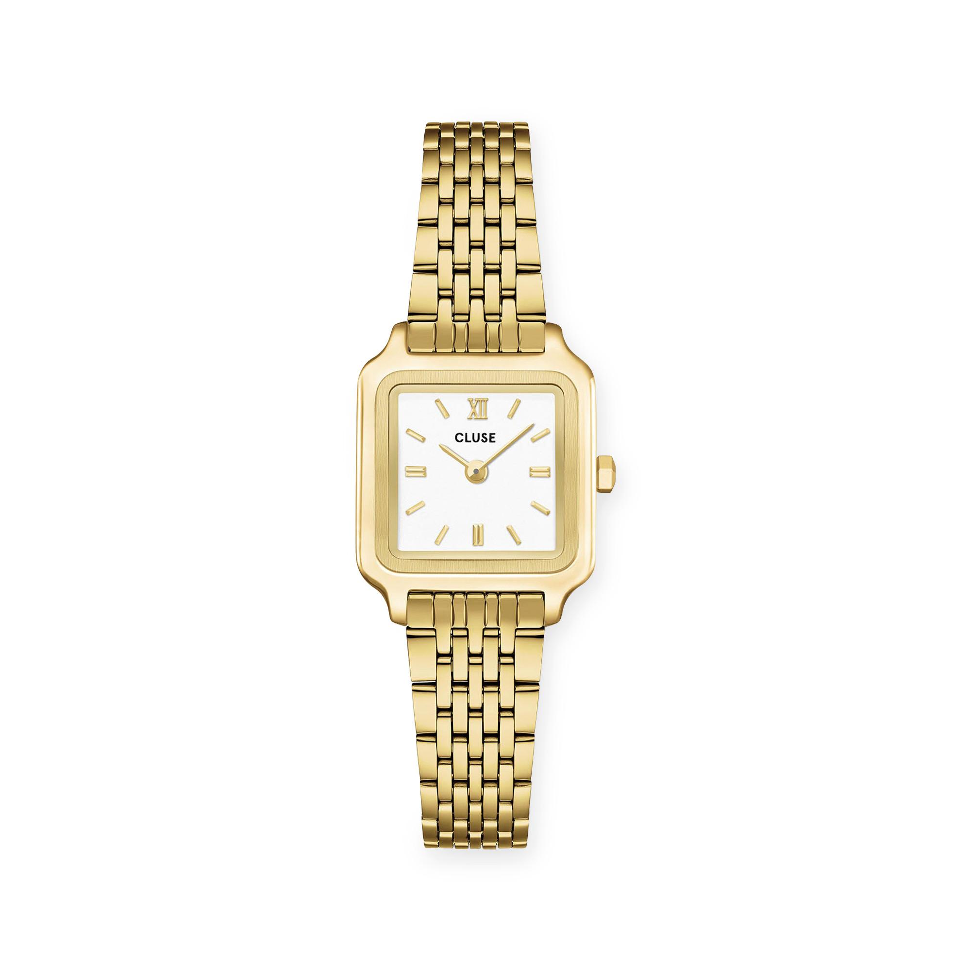 La Gracieuse Mini séduit par son boîtier carré de 21 mm au ton doré et son cadran blanc au design épuré et moderne. Son bracelet en acier inoxydable doré de 12 mm complète l’ensemble avec élégance et polyvalence. Grâce au système de bracelets interchangeables, la montre peut être facilement personnalisée avec n’importe quel bracelet CLUSE de 12 mm, pour s’adapter à votre style au quotidien.