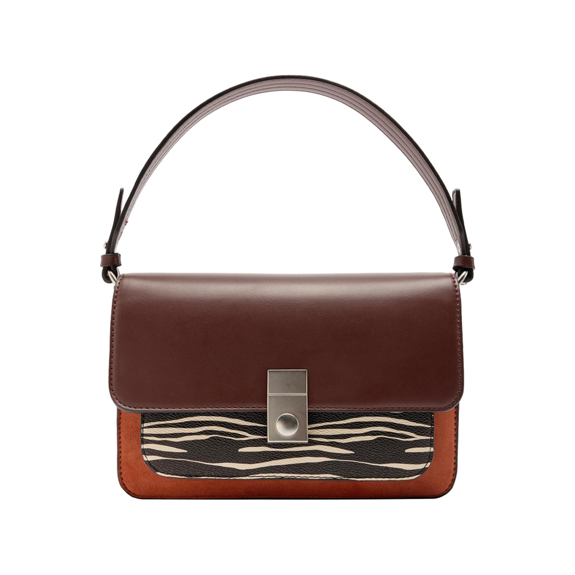 Ce sac à main présente un design sophistiqué avec une fermeture à rabat et un empiècement distinctif à imprimé zèbre. Il est équipé d'une poignée supérieure et d'une bandoulière amovible et réglable, offrant des options de transport polyvalentes. L'intérieur du sac est conçu pour être pratique, offrant amplement d'espace pour les essentiels quotidiens.