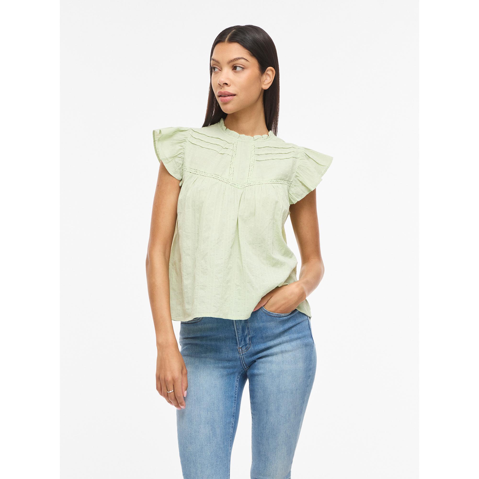 Ce chemisier présente un col montant avec de délicats volants et un détail en trou de serrure au dos. Le devant est orné de plis nervurés et d'empiècements en dentelle, ajoutant une touche d'élégance. Des manches courtes à volants complètent ce charmant design.
