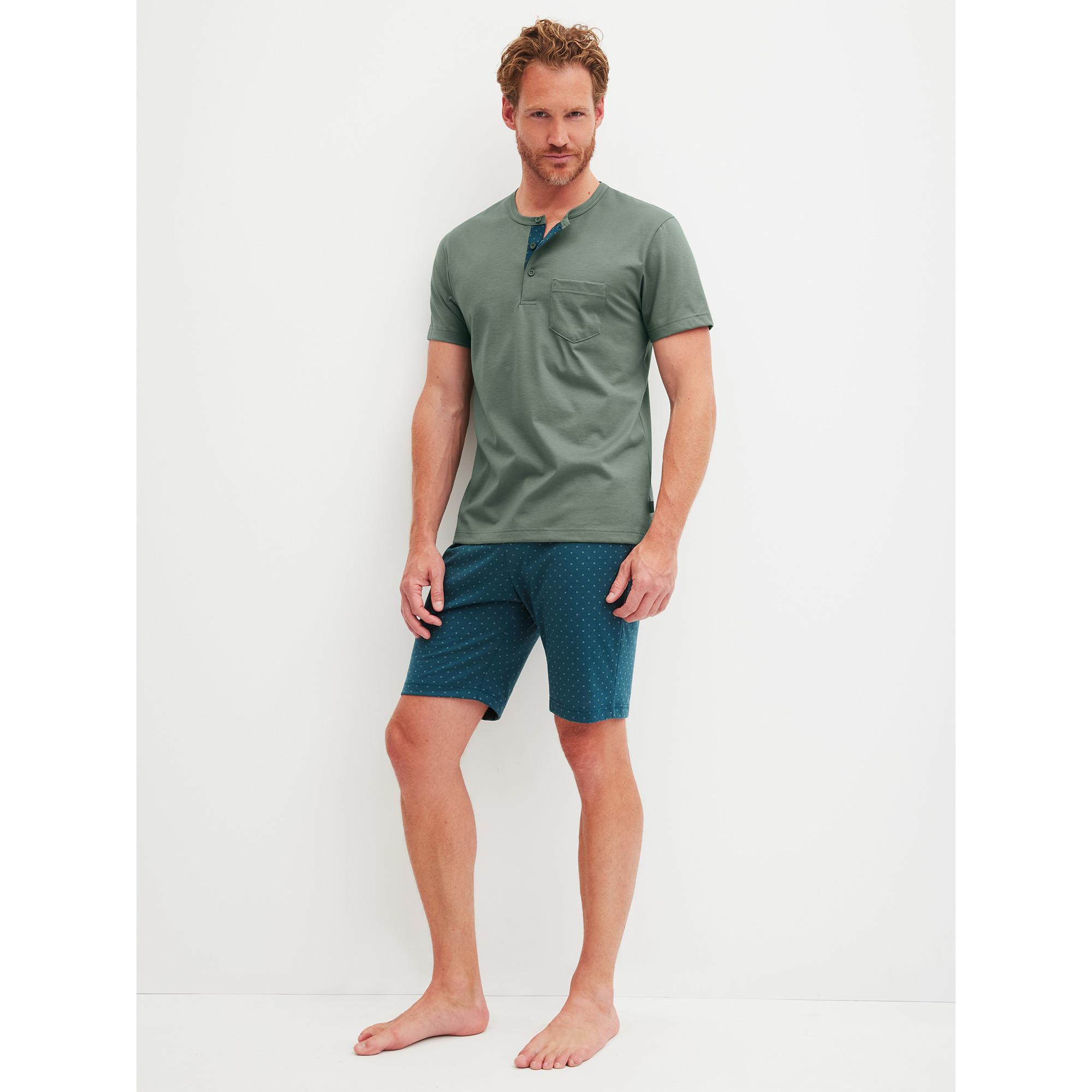 Cet ensemble de pyjama offre une option confortable et élégante pour les vêtements de détente ou de nuit. Le haut présente un design à manches courtes avec un col Henley, offrant une coupe décontractée. Une petite poche poitrine ajoute un détail fonctionnel. Le short assorti est conçu avec un motif géométrique, ajoutant une touche moderne à l'ensemble.