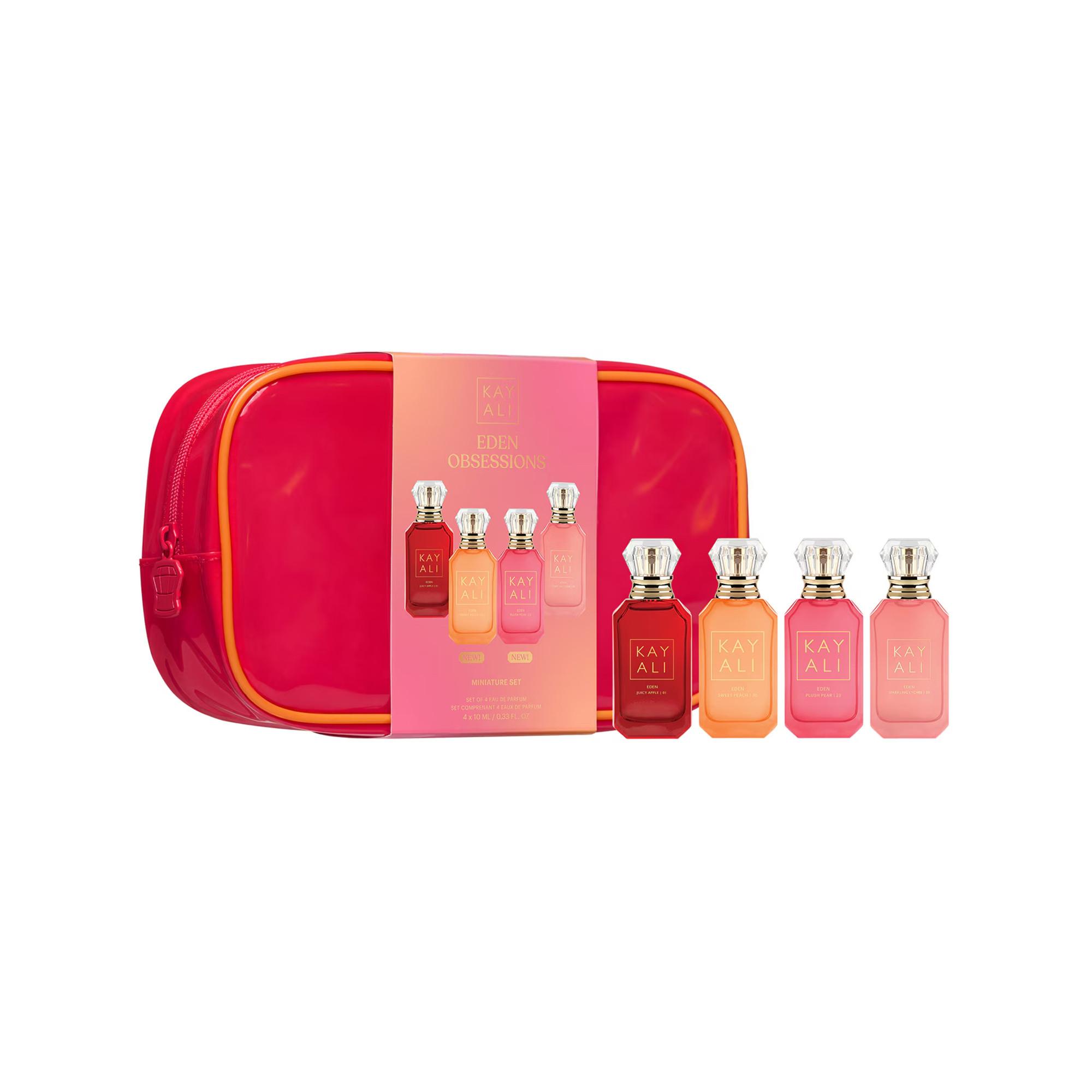 Un voyage au cœur d'un monde de séduction fruitée avec le coffret miniature en édition limitée KAYALI Eden Obsessions. Idéal pour offrir ou collectionner, ce coffret enchanteur réunit les quatre parfums Eden : Eden Juicy Apple | 01, Eden Plush Pear | 23, Eden Sweet Peach | 35 et Eden Sparkling Lychee | 39, dans leur précieux format miniature de luxe de 10 ml.
